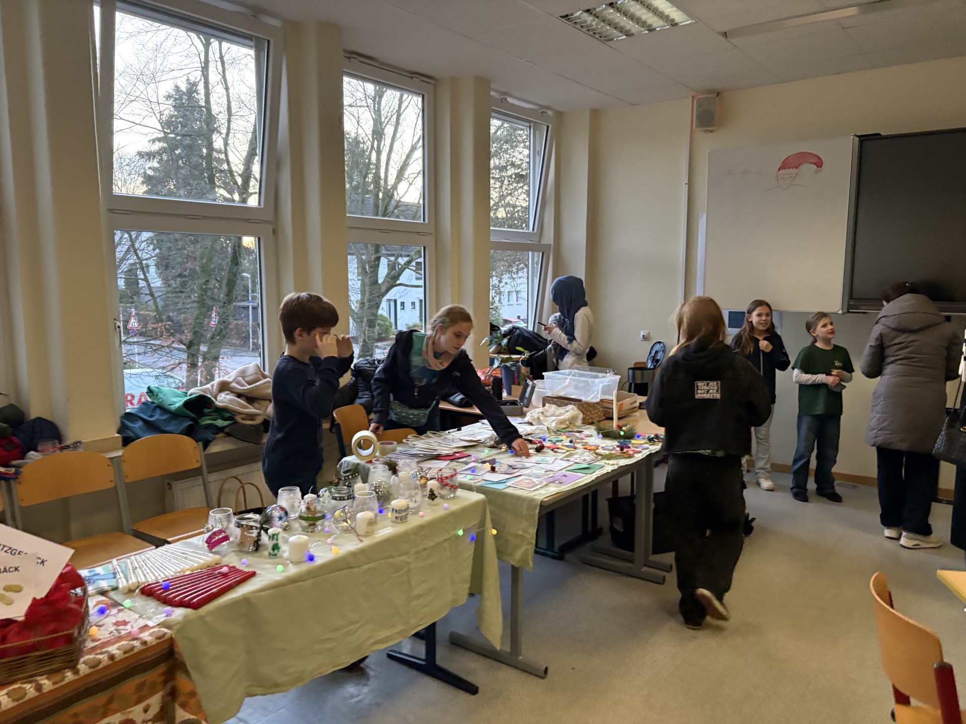 Am Donnerstagnachmittag hat der alljährliche Adventbasar der Jahrgangsstufen 5-6 stattgefunden. Es war auch in diesem Jahr wieder eine wunderschöne Veranstaltung, bei der die Schüler:innen ihre selbstgebastelten und gebackenen Weihnachtsartikel verkaufen konnten. Der Kreativität waren keine Grenzen gesetzt. Highlight war auch in diesem Jahr wieder die Tombola des Fördervereins, für die die Eltern und Schüler:innen in einer langen Schlange anstanden. Vielen Dank für alle Spenden! Der Erlös des Nachmittags wird auch in diesem Jahr wieder der Suppenküche übergeben. Die Klasse, die den höchsten Betrag erzielt hat, darf auch in diesem Jahr den Scheck überreichen!