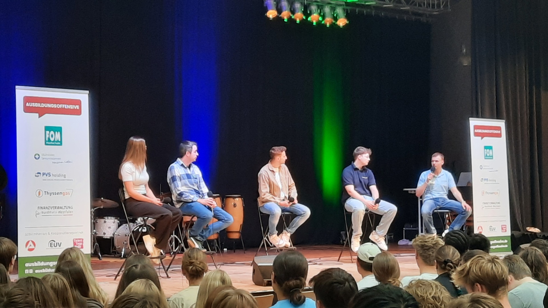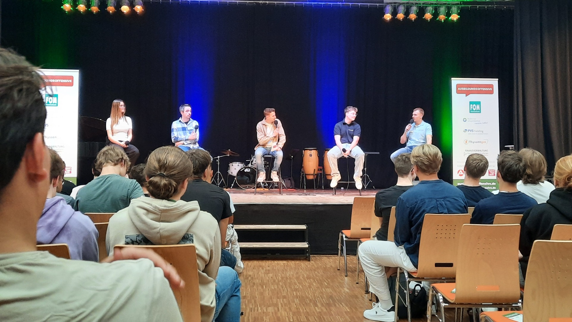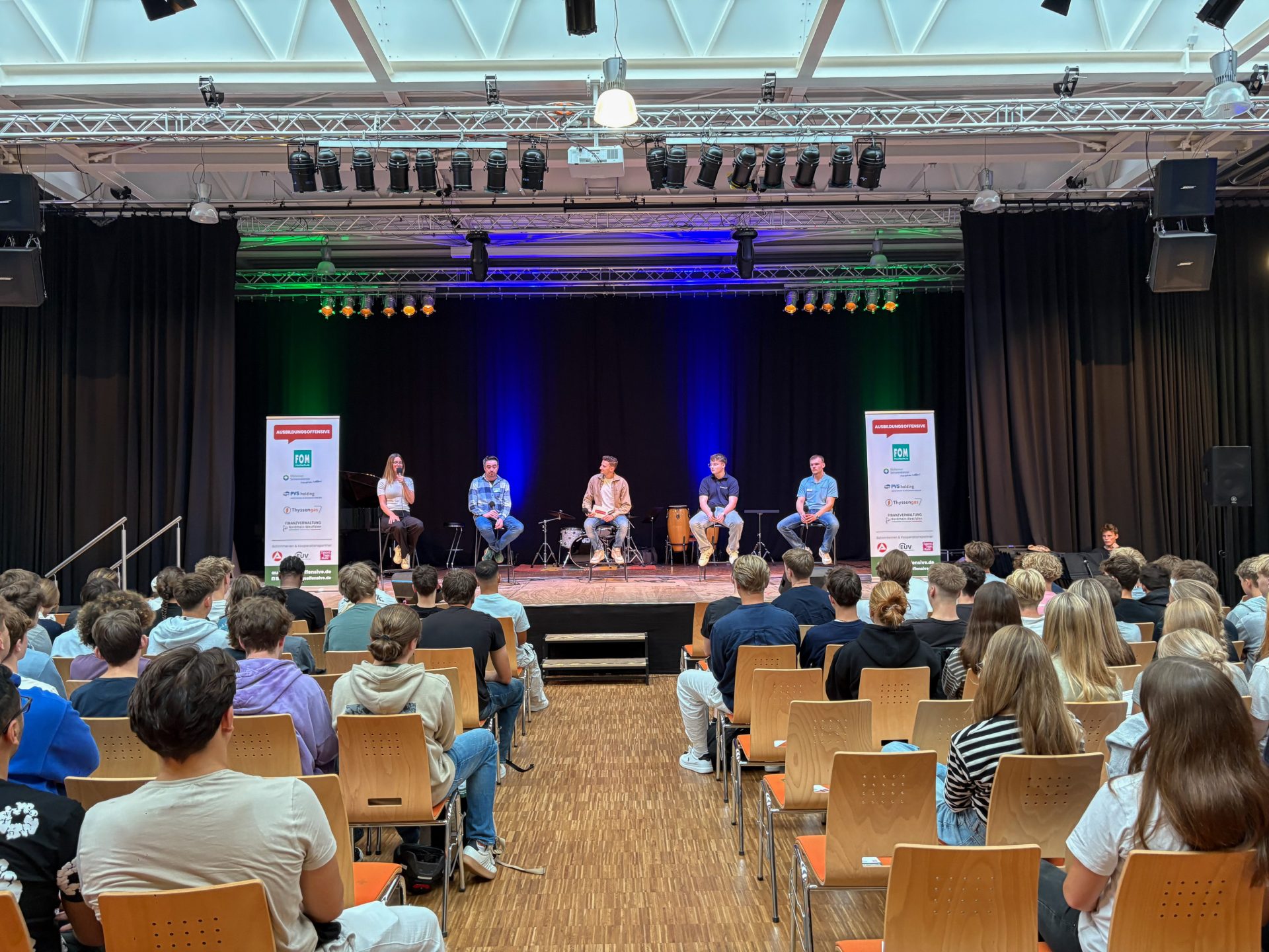 Am 2. Schultag machte die "Ausbildungsoffensive" einen Stopp an der Luisenschule. Azubis des Dienstleisters PVS-Holding, der FOM-Hochschule, die duale Studiengänge anbietet, der Firma Thyssengas und dem Finanzamt zeigten den Oberstufenschüler:innen der Luisenschule auf, wie der Start ins Berufsleben aussehen kann. Moderiert wurde der Talk von Joshua, einem Moderator von Radio Essen. Anschließend gab es noch die Gelegenheit, bei einer Berufsbörse sich quasi auf Augenhöhe mit den Azubis auszutauschen.