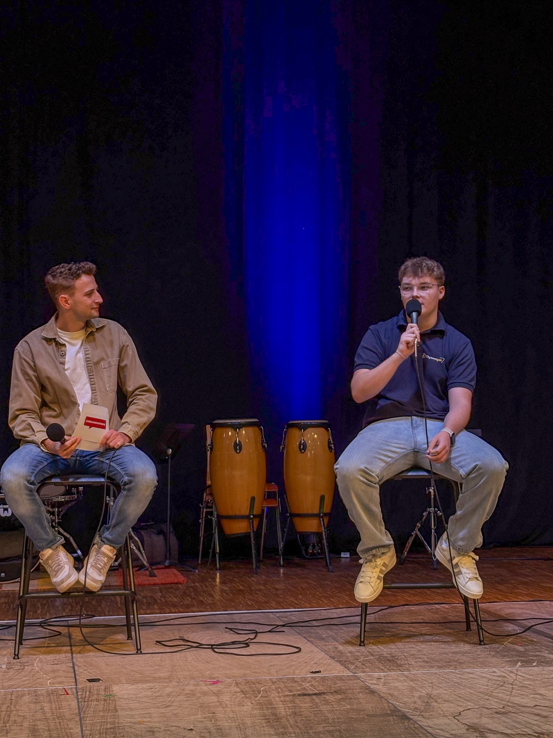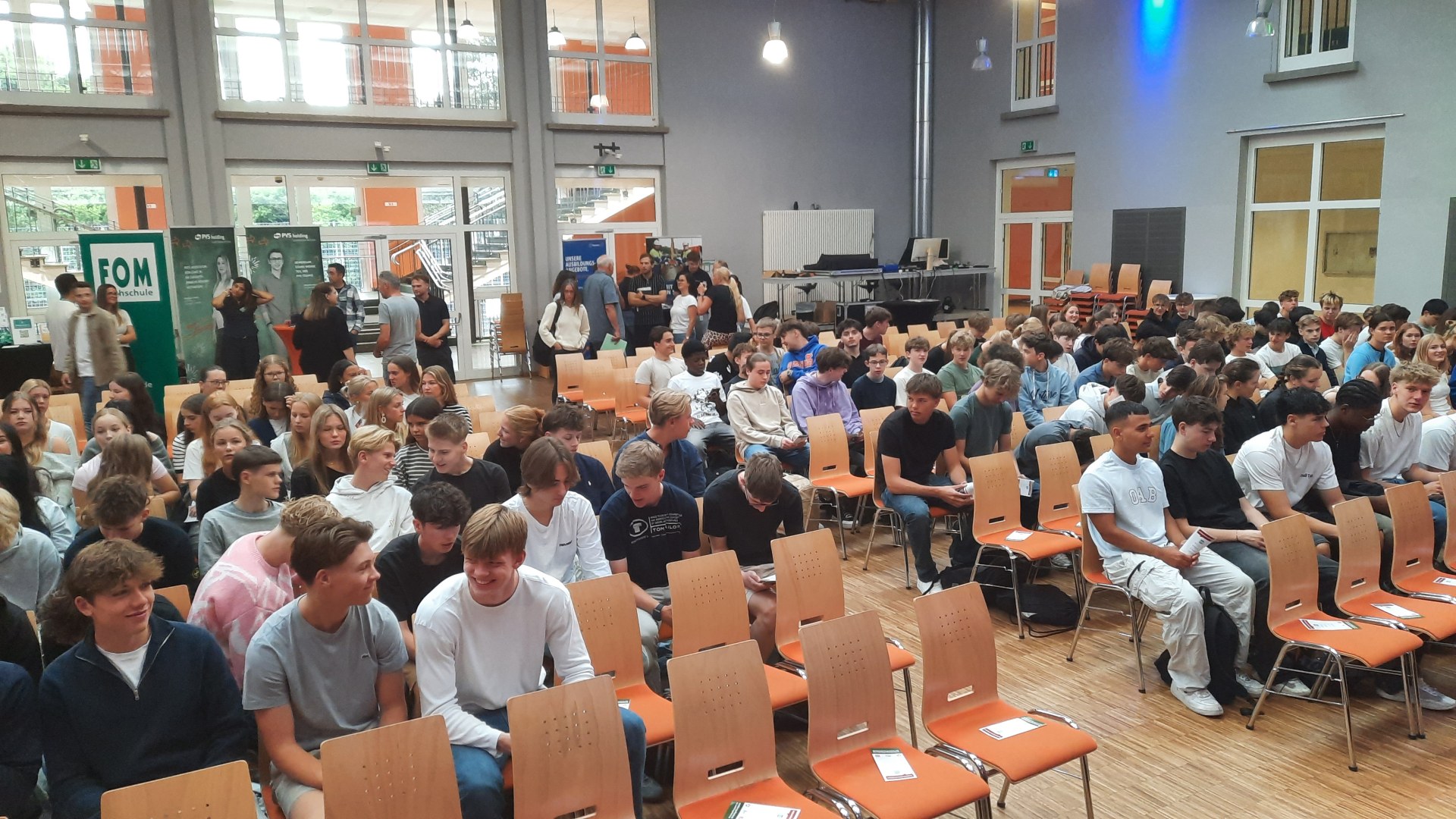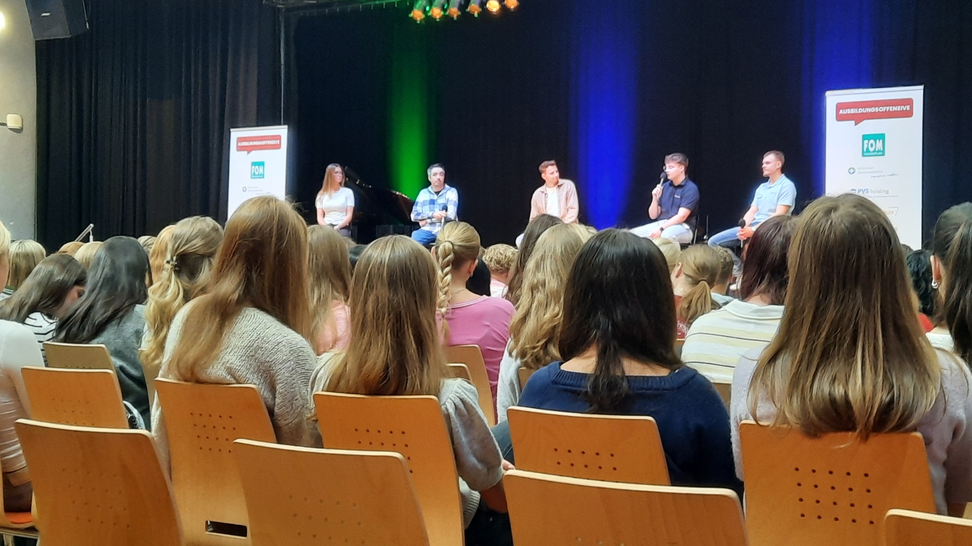 Am 2. Schultag machte die "Ausbildungsoffensive" einen Stopp an der Luisenschule. Azubis des Dienstleisters PVS-Holding, der FOM-Hochschule, die duale Studiengänge anbietet, der Firma Thyssengas und dem Finanzamt zeigten den Oberstufenschüler:innen der Luisenschule auf, wie der Start ins Berufsleben aussehen kann. Moderiert wurde der Talk von Joshua, einem Moderator von Radio Essen. Anschließend gab es noch die Gelegenheit, bei einer Berufsbörse sich quasi auf Augenhöhe mit den Azubis auszutauschen.