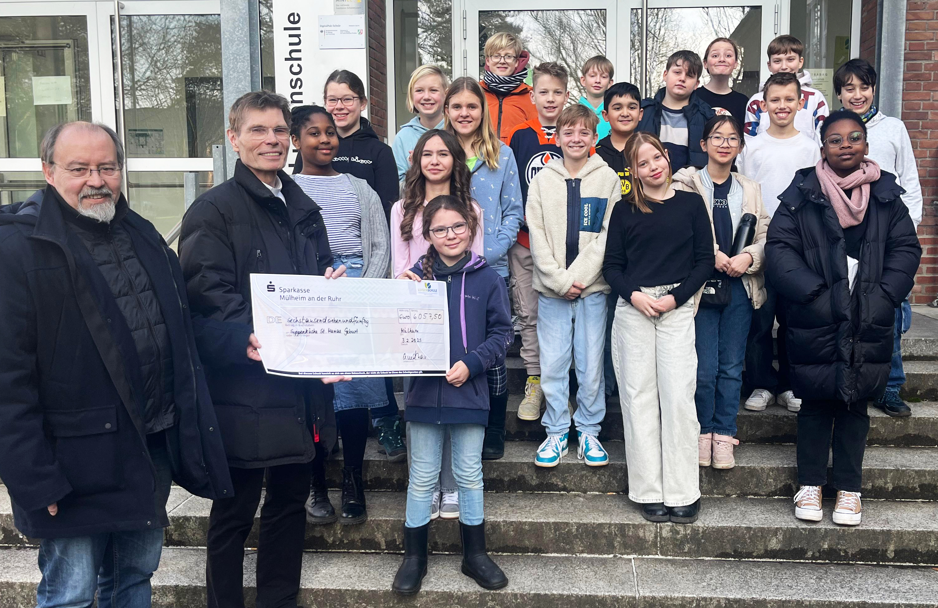 Durch das enorme Engagement der gesamten Schulgemeinschaft beim Charitylauf und aller hochmotivierten fünften und sechsten Klassen und ihrer Eltern beim Adventbasar im November konnte eine stolze Summe erzielt werden, die Kinder der Klasse 6b stellvertretend für die Schule überreichen durften. Die Luisenschule spendet nun schon seit mehreren Jahren Geld für die ausschließlich über Spenden finanzierten Kochgruppen „Mittagstisch“ und „Suppenküche“, die im Gemeindezentrum St. Joseph in Heißen bedürftigen Menschen regelmäßig eine warme Mahlzeit ermöglichen.