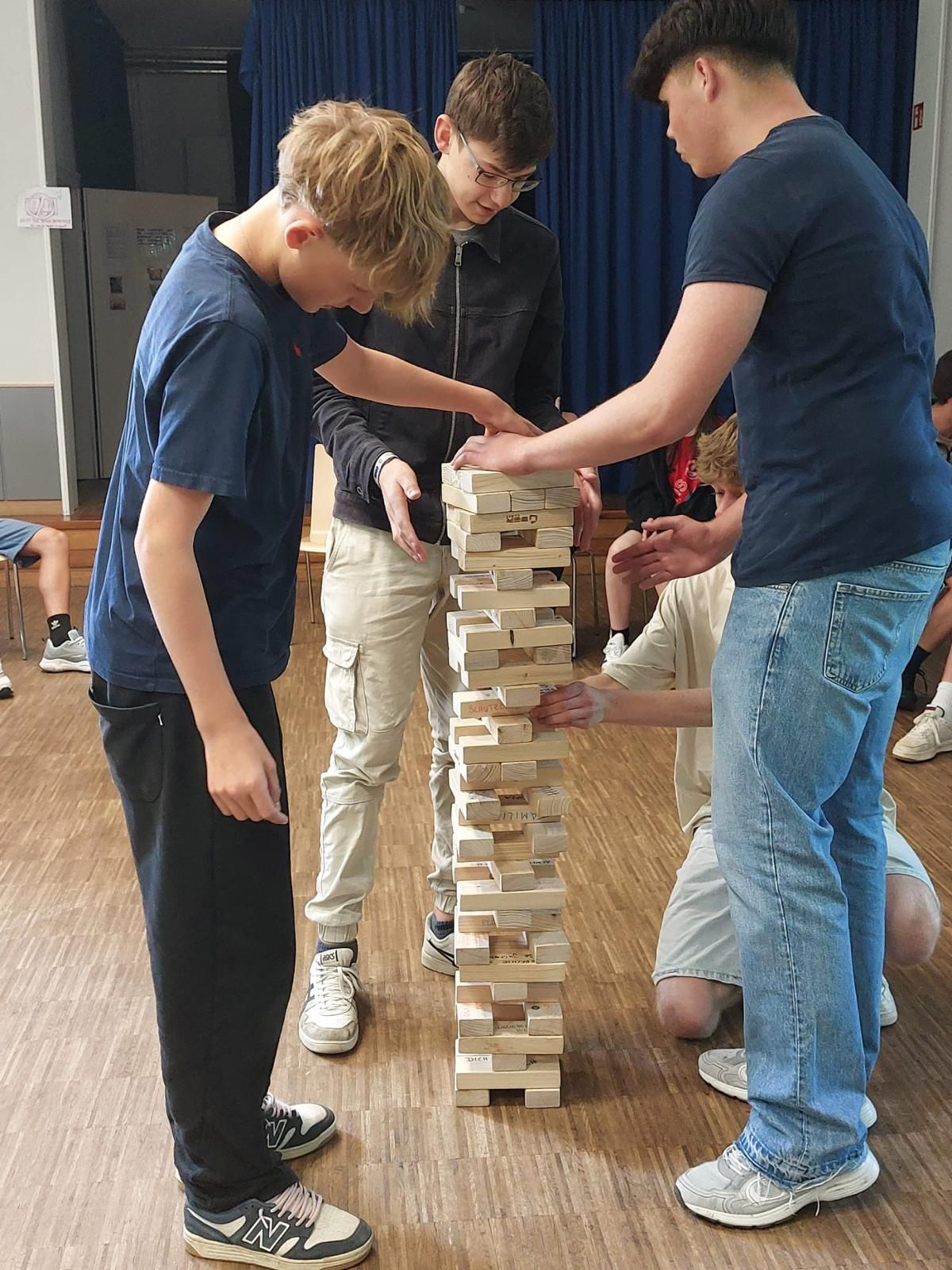 Am ersten Tag ging es direkt aktiv los. Durch verschiedene Spiele wurde das Klassengefühl gestärkt. Beim gemeinsamen Jenga-Spiel halfen alle mit, um den Turm so hoch wie möglich zu bauen, wodurch Zusammenarbeit und Rücksichtnahme deutlich wurden.