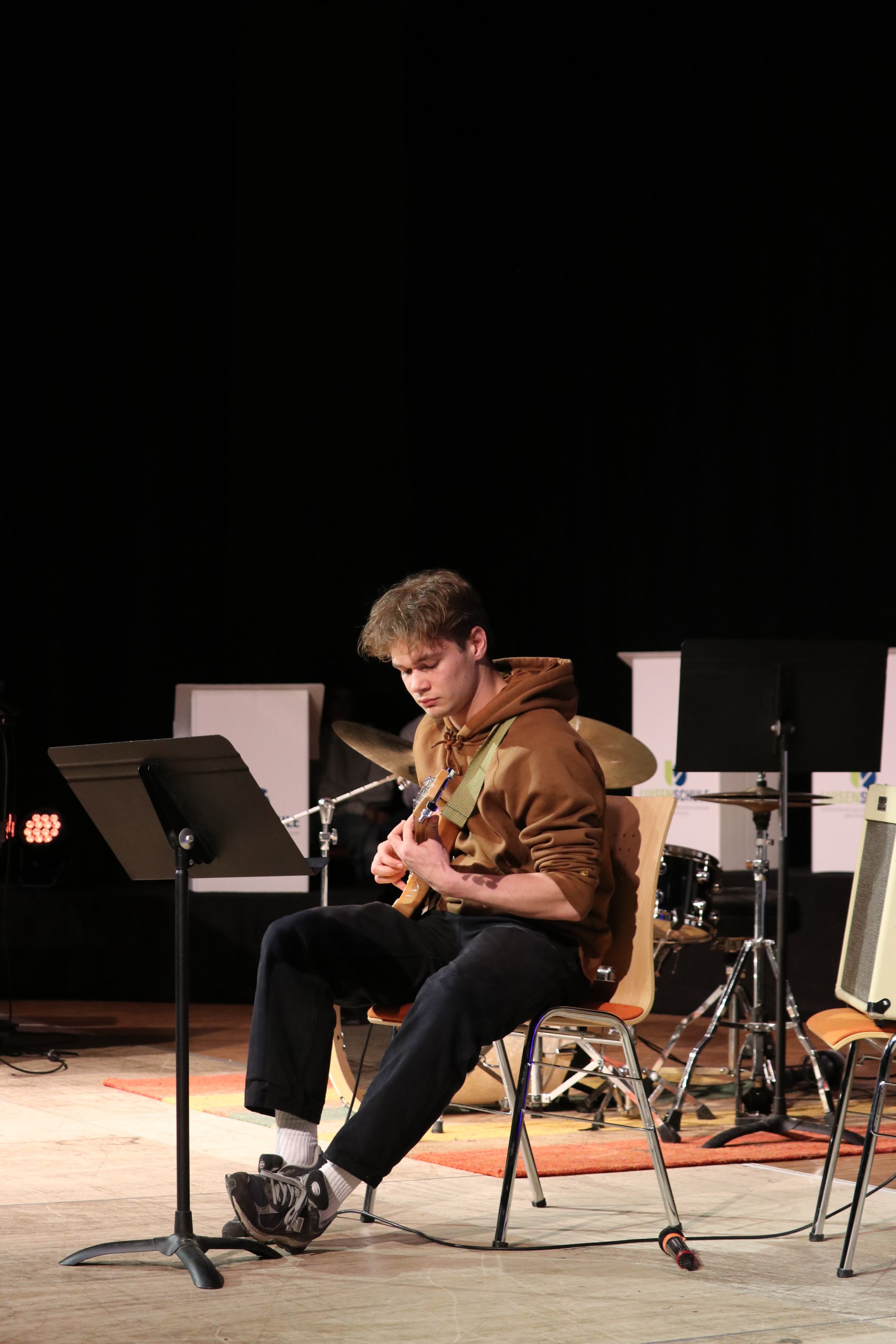Mit Jorin Steger (Q1), der den Jazz-Standard All The Things You Are präsentierte, Lennart Urban (8b), der ein Medley von Metallica-Balladen spielte, und Anna Weis (9b) mit Vidalita überzeugten an diesem Abend zudem drei Solo-Gitarrist:innen. Als weitere Solist:innen anderer Instrumentengruppen begeisterten darüber hinaus noch Nestor Pantazis (5c) am Schlagzeug zu Sweet Child O’Mine von Guns’N’Roses, Fabian Walter (10a) an der Oboe mit Bachs Siciliano sowie Sophia Geist (8a) mit einem Auszug aus dem Violinkonzert von Anatoli Komarowski.