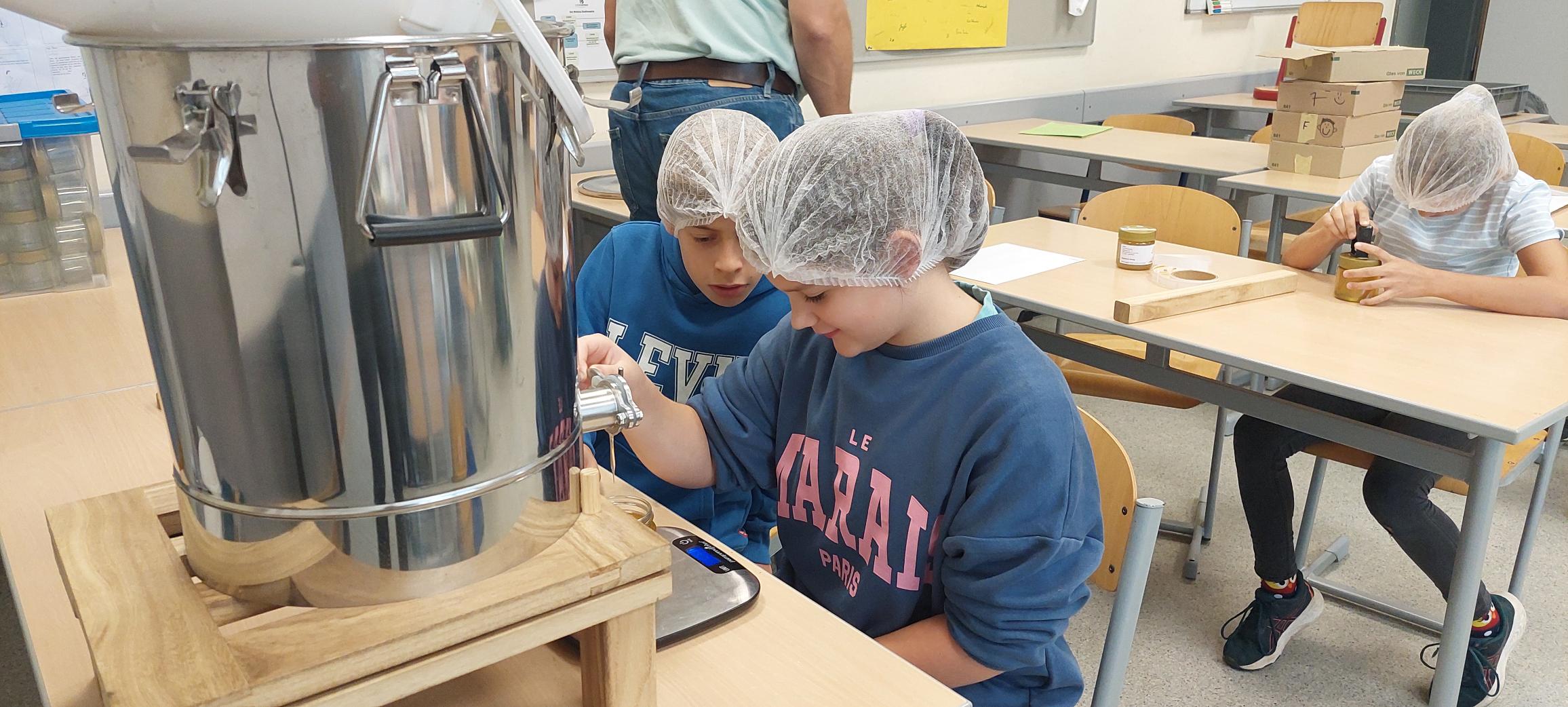 Am ersten Oktober konnten wir endlich den Ertrag unsrer Arbeit aus der Abfüllkanne in die Honiggläser abfüllen. Goldenes Licht des Sommers scheint nun in Gläsern für den Winter bewahrt. Dank an unsere fleißigen Bienen und die ebenso fleißige Bienen-AG. Nach dem Abfüllen mussten die Gläser noch etikettiert und mit einem Gewährverschluss versehen werden. Dies lief in unsrer AG wie vom Fließband. Nun steht dem Verkauf des Honigs auf unserem Adventsbasar nicht mehr entgegen und auch wir freuen uns, den neuen Honigjahrgang 2024 genießen zu dürfen.