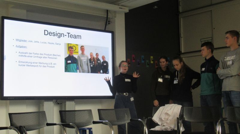 Daraus errechneten sie in der Folge den benötigten Preis pro Becher. Diesen konnten sie dann durch clevere Umstrukturierungen von anfangs über 160€ auf 2,70€ senken. Damit der Becher jedoch auch gekauft wird, hat das Design-Team eine Marketing-Strategie und eine Werbung entworfen. Dieses Team war auch für das Design des Bechers zuständig. Um ein reibungsloses Zusammenspiel der einzelnen Abteilungen zu ermöglichen, gab es das Kommunikations-Team. Diese Schüler stellten auch gleichzeitig die Firmenleitung dar und waren für den notwendigen Zeitdruck, die Dokumentation der Arbeitsfortschritte sowie die Kommunikation zwischen den einzelnen Teams verantwortlich. Sie erstellten auch einen kurzen Film, welcher die besten Momente des Tages zeigte.