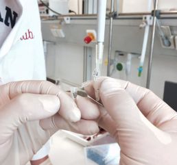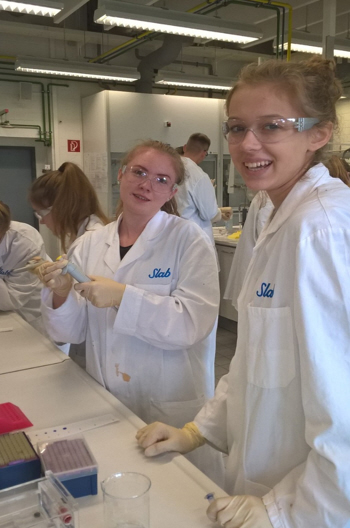 Im Schülerlabor angekommen, ging es nach einer kurzen Anleitung direkt in die Praxis. In Zweiergruppen erhielten die „Jungforscher“ ihre Arbeitsmaterialien und konnten umsetzen, was über viele Wochen theoretisch behandelt worden war: Isolierung und Vermehrung von DNA, sowie die abschließende Auswertung mit der Gelelektrophorese. Das am häufigsten genutzte Arbeitsgerät war die Mikroliterpipette, mit der immer wieder kleinste Mengen Flüssigkeit abgemessen werden mussten. Zur Stärkung stand auch ein gemeinsames Mittagessen in der Universitätsmensa auf dem Plan.