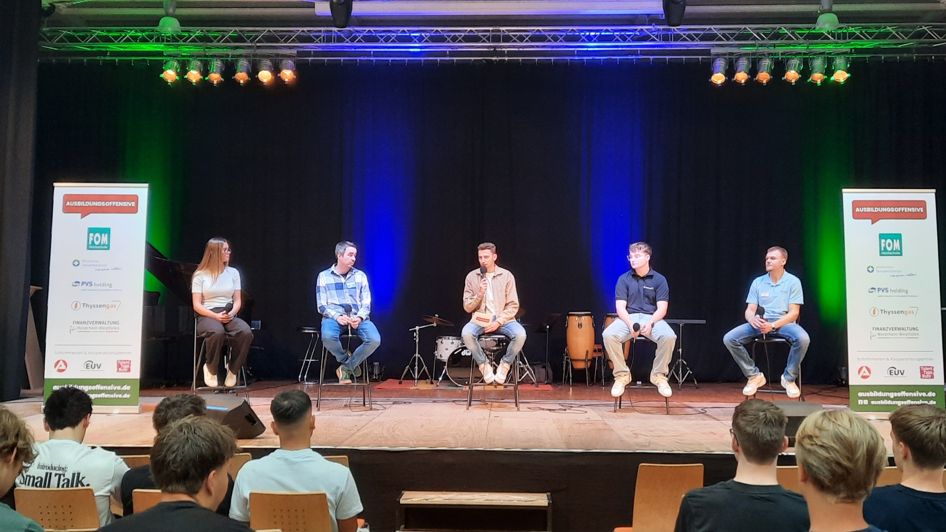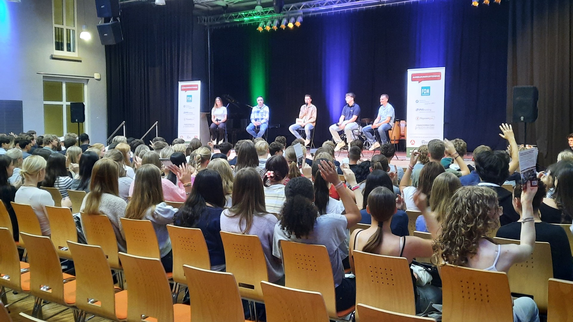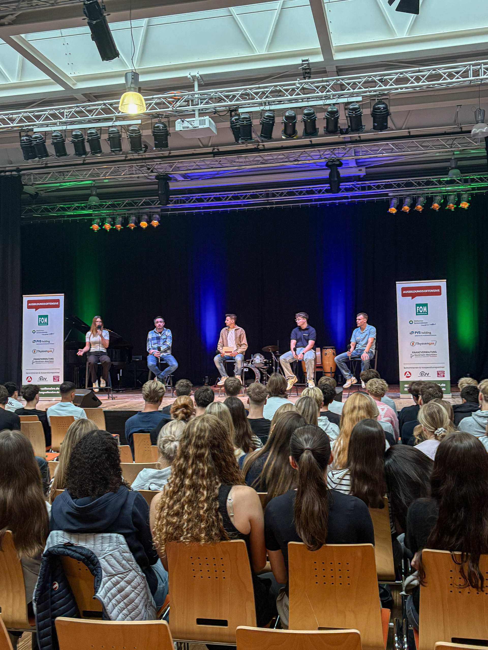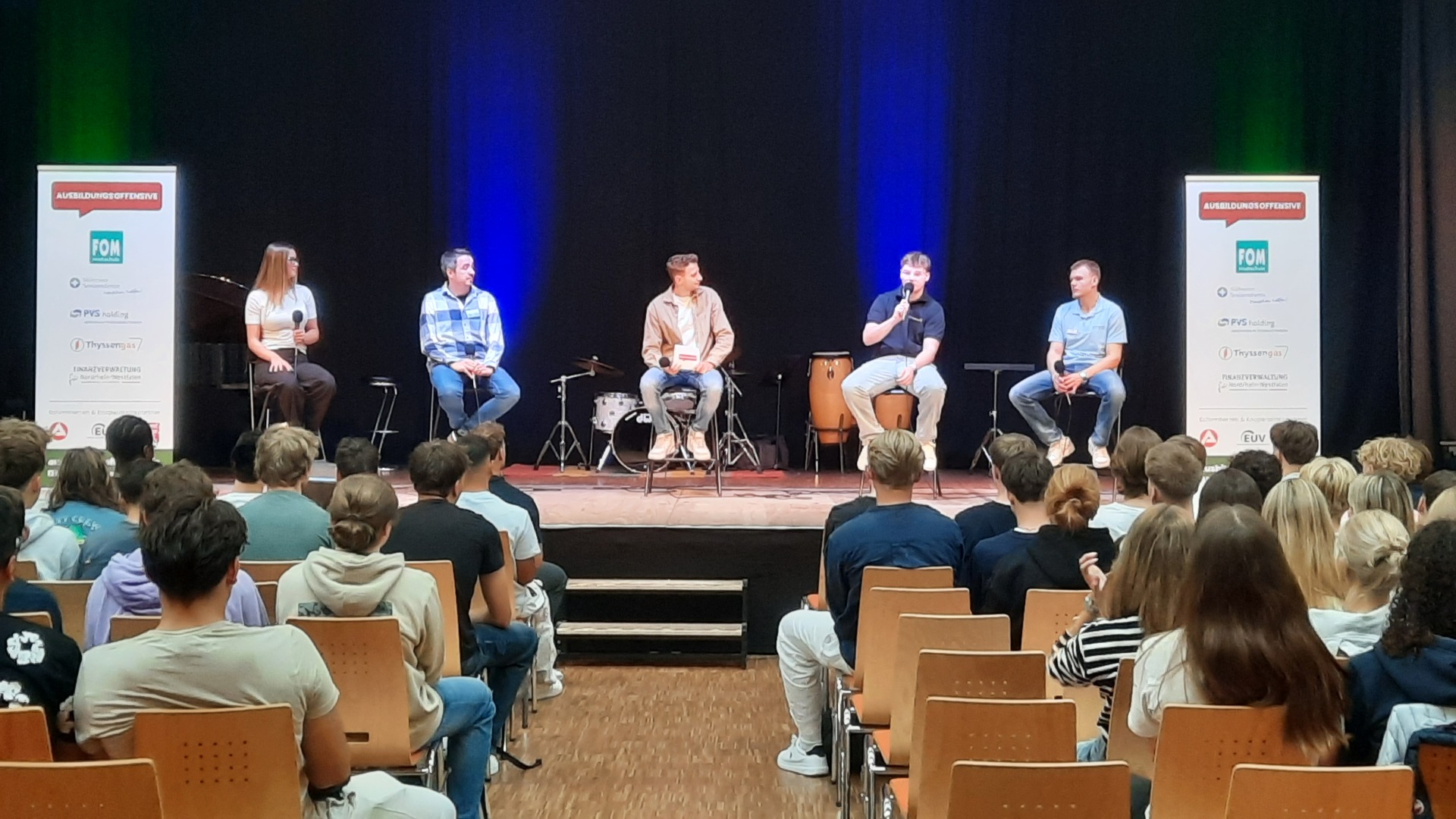 Am 2. Schultag machte die "Ausbildungsoffensive" einen Stopp an der Luisenschule. Azubis des Dienstleisters PVS-Holding, der FOM-Hochschule, die duale Studiengänge anbietet, der Firma Thyssengas und dem Finanzamt zeigten den Oberstufenschüler:innen der Luisenschule auf, wie der Start ins Berufsleben aussehen kann. Moderiert wurde der Talk von Joshua, einem Moderator von Radio Essen. Anschließend gab es noch die Gelegenheit, bei einer Berufsbörse sich quasi auf Augenhöhe mit den Azubis auszutauschen.