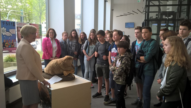 Mülheims erste Bürgermeisterin, Margarete Wietelmann, begrüßte unsere Schülerinnen und Schüler der 7d sowie Vertreter des Umweltausschusses und des Landschaftsbeirates im Foyer des Historischen Rathauses. Die Ausstellung zeigt das vielfältige Leben im und am Fluss, es wird deutlich, wie stark die Gewässer unsere Landschaft prägen. Die siebte Klasse der Luisenschule war die erste, die die interaktiven Spiele, Infotafeln und Quizfragen der Wanderausstellung ausprobieren durfte. Insbesondere der Biber hatte es den Schülern und Schülerinnen angetan und man konnte ihm wirklich mal auf den Zahn fühlen. Anschließend wurden die Modelle und interaktiven Ausstellungsstücke gemeinsam ausgiebig ausprobiert und die Erkenntnisse diskutiert.
