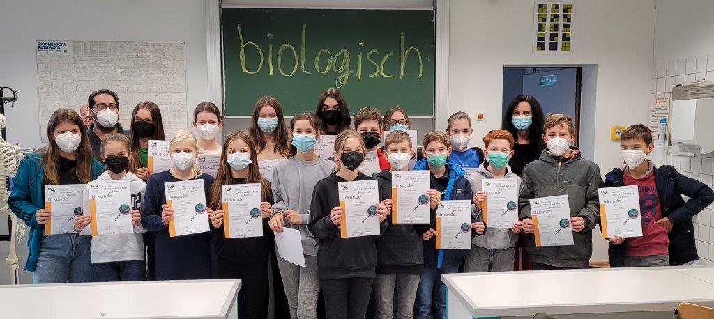 Zusammen mit allen Teilnehmern der MINT-AG, die von Herrn Durmuş geleitet wird, haben wir an der diesjährigen Runde des Schülerwettbewerbs „bio-logisch!?“ teilgenommen. Seit 2002 wird der Wettbewerb vom Land NRW eingerichtet und mit wechselnden Partnern durchgeführt. In einer Zeitspanne von mehreren Wochen haben sowohl die Teilnehmenden der AG aus den Jahrgangsstufen 5 & 6, als auch die Helfenden aus den Jahrgangsstufen 8 & 9 fleißig an den Aufgaben gearbeitet. Immer wieder haben wir auch Experimente, die Inhalt der Aufgaben waren, durchgeführt und anschließend besprochen. Die diesjährige Runde drehte sich um das Thema „Nicht auf den Kopf gefallen!“. Einige Aufgaben behandelten die Neurobiologie, aber auch das Erarbeiten von Lernstrategien und deren Wirkung wurde thematisiert. Zum Abschluss des Wettbewerbs gab es für alle Teilnehmenden Urkunden, die uns von Frau Dr. Quednau und Herrn Durmuş überreicht wurden. Wir sind schon auf die nächste Runde gespannt, die unter dem Motto „Global Food - Ein Blick über den Tellerrand…“ stattfindet.