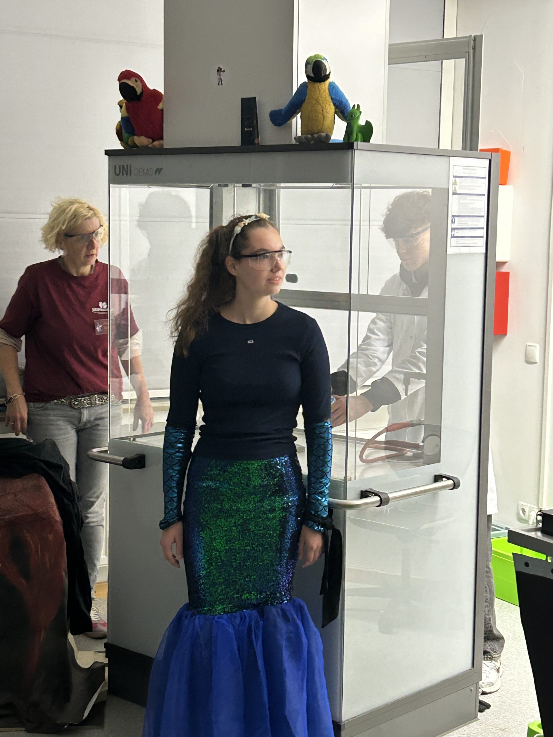 Der Projektkurs Chemie, geleitet von Beate Schulte, hat sich auch in diesem Jahr wieder ein ganz besonderes Programm ausgedacht, um bei den Grundschüler:innen das Interesse an der Chemie zu wecken. Gemeinsam mit seiner Crew überzeugt Kapitän „Krumme Socke“ eine wunderschöne Meerjungfrau davon, ihren Namen zu verraten und ihnen ihren Schatz zu überlassen. Das schaffen sie durch eindrucksvolle Experimente, die die Kinder zum Staunen bringen. Im Anschluss experimentieren die Kinder mit den Schüler:innen des Projektkurses und gehen beeindruckt zurück an ihre Schulen. Als kleine Geschenke bekommen sie Schatztruhen in Miniausführung, die die 3-D-Druck-AG für die Kinder ausgedruckt hat.