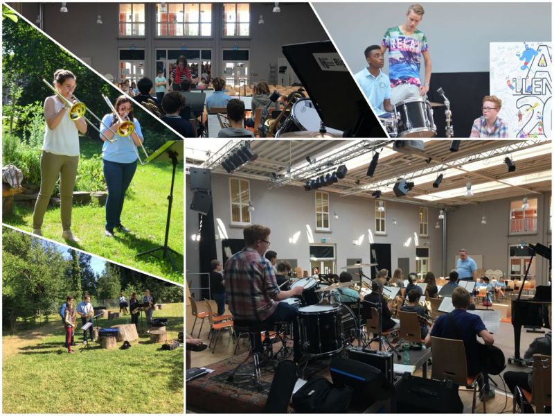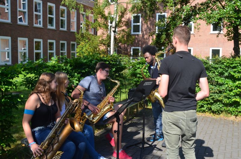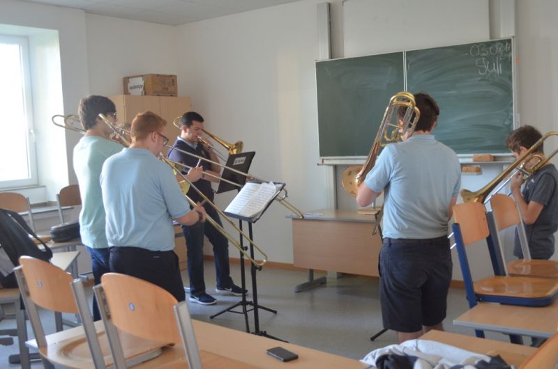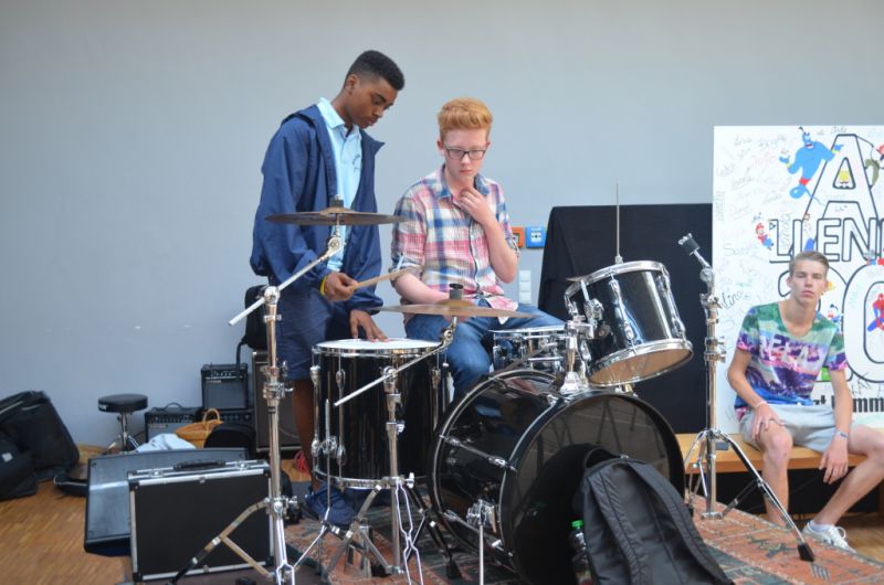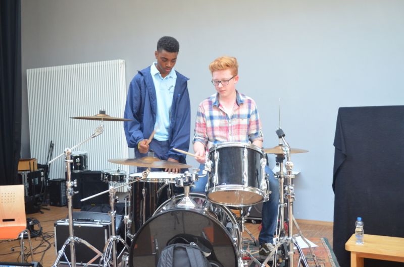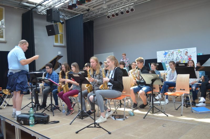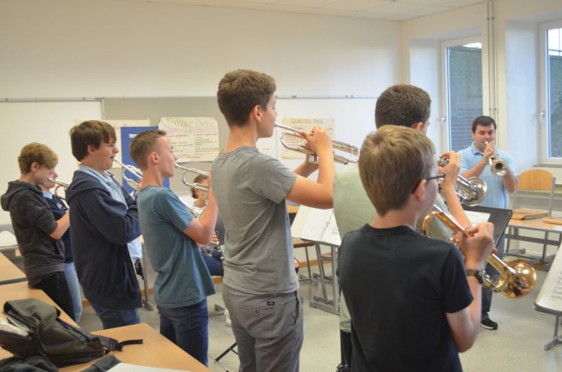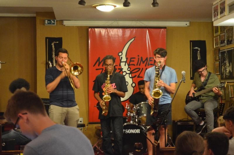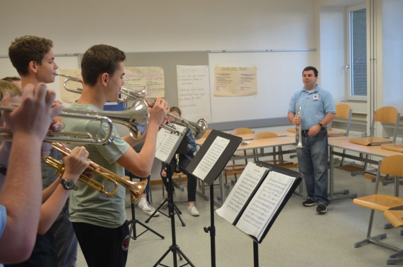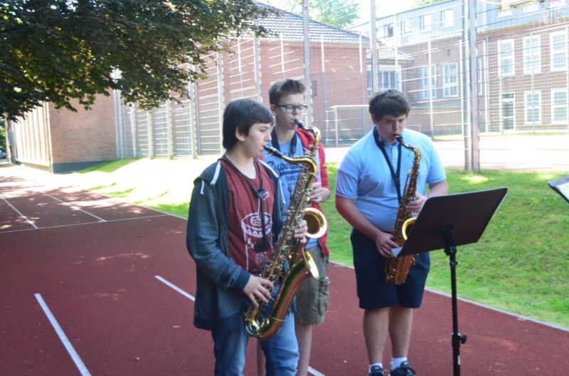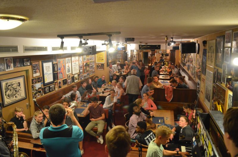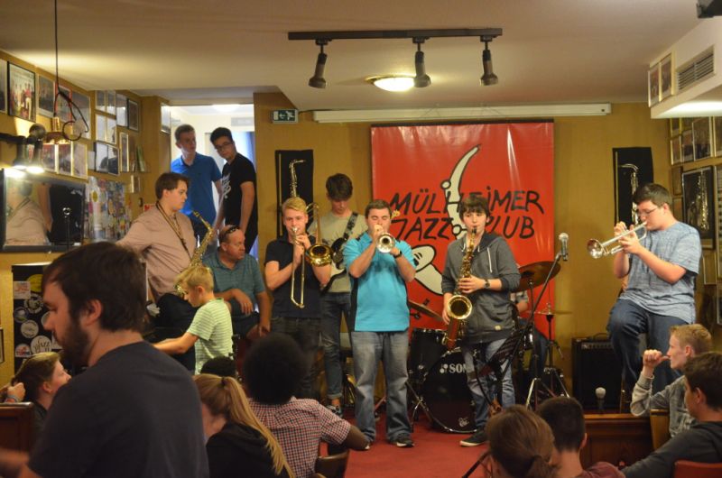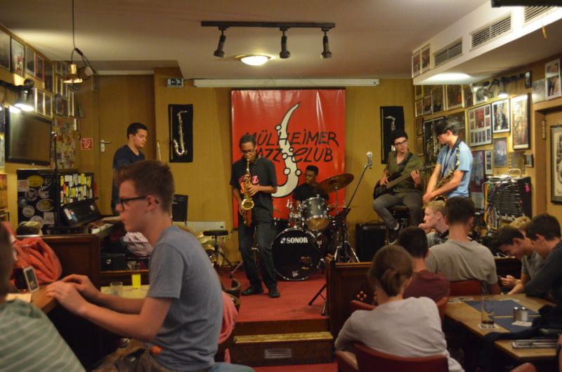 Montag konnten wir dann alle nach einem anstrengenden ersten Tag ausschlafen, da das Programm für diesen Tag erst am späten Vormittag begann. In vielen kleinen Workshops konnten wir unseren Sound verbessern und übten mit den Blue Lakern gemeinsame Stücke ein. Dies alles funktionierte trotz der verschiedenen Sprachen sehr gut. Der Montagnachmittag stand uns dann frei zur Verfügung. Viele Gastfamilien schlossen sich in Gruppen zusammen und unternahmen eine Fahrradtour oder spielten auf dem Schulhof Fußball und Basketball. Am Abend trafen wir uns dann im Mülheimer Jazz Club wieder, um bei kalten Getränken und in einer entspannten Atmosphäre zu Jammen, d.h. Improvisation zur Melodie von einfachen Liedern.