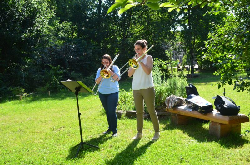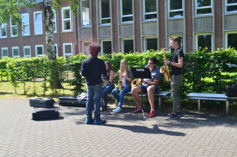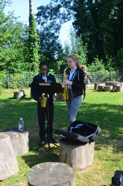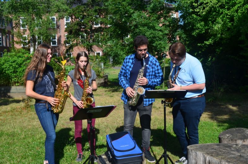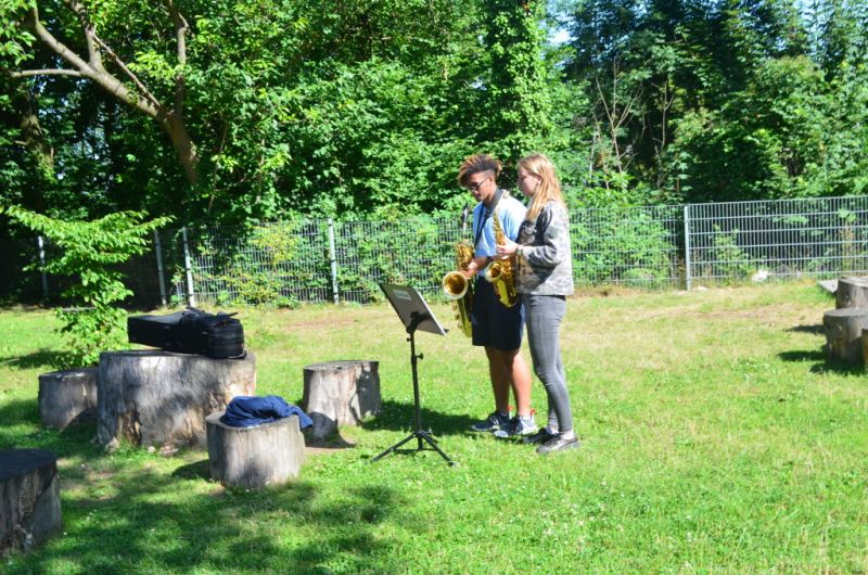 Ungeduldig, unsere Gäste endlich kennenzulernen, erwarteten wir sie schon sehnsüchtig. Nachdem das Gepäck ausgeladen war und jeder Blue Laker seine Gastfamilie gefunden hatte, ging es für unsere amerikanischen Gäste zum ersten Mal in die Gastfamilien. Dort zeigten wir ihnen ihr Zimmer, aßen zusammen Mittag und freuten uns festzustellen, wie gut es plötzlich funktionierte, in einer fremden Sprache Gespräche über Schule, Musik, Familie oder Sport zu führen. Viel Zeit blieb nicht, da am Nachmittag bereits das erste gemeinsame Konzert stattfinden sollte. Im Rahmen der „Kurkonzerte in Bad Mülheim“ traten wir in der Freilichtbühne vor einem großen Publikum auf, das trotz des schwankenden Wetters gekommen war. Die Bigband der Luisenschule eröffnete das Konzert mit einigen Stücken aus ihrem Repertoire , bevor dann unter großem Applaus das Blue Lake Jazz Ensemble übernahm. Unter Leitung von Glenn Williams spielte das Ensemble viele bekannte wie unbekannte Jazz-Stücke und begeisterte das Publikum durch ihre Musik und Lockerheit. Nach dem Konzert ging es dann wieder nach Hause, wo ein individuelles Abendprogramm anstand. Gemeinsames Musizieren, das Erkunden Mülheims, oder gemeinsames Fußball gucken verhalfen allen zu einem unvergesslichen Abend.