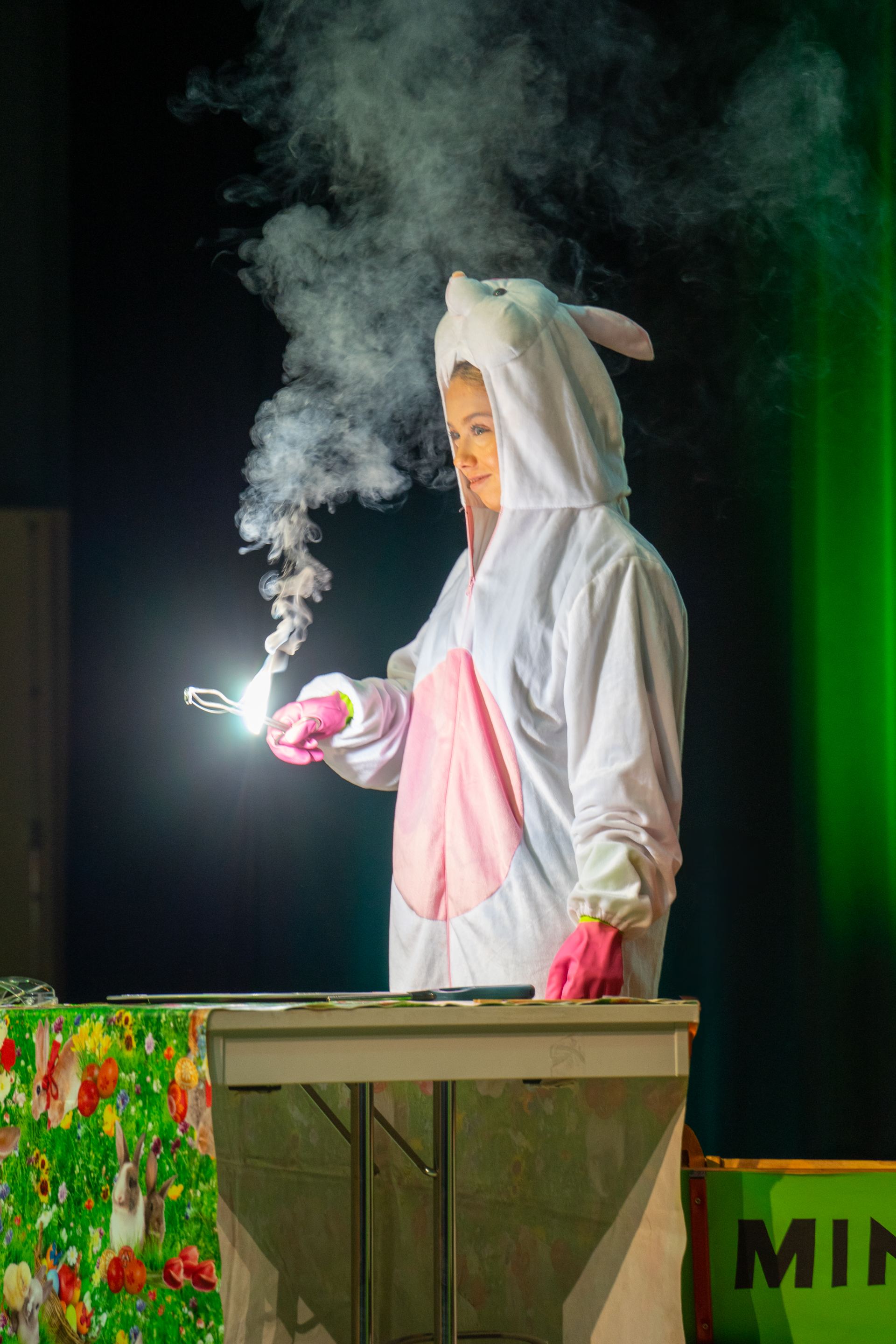Um 13.00 Uhr ging es mit einer vollendenden Veranstaltung ins Finale der drei Forschertage. Anmoderiert von Greta und Lasse, fing mit einer kurzen Einleitung als erstes Frau Dr. Quednau die Aufmerksamkeit aller Anwesenden. Sie leitet den Abschluss ein und begrüßte alle Teilnehmer:innen, die sich nun in ihren Gruppen in der Aula eingefunden haben. Im Anschluss begeisterte ein kurzer Filmrückblick auf den Montag und Dienstag die Menge. Louis hat dafür an den beiden Tagen fleißig Fotos und Videos gemacht und diese in der Nacht auf unseren letzten Tag zusammengestellt. Nach einer Rede unserer MINT-Koordinatorin und AG-Leiterin Frau Dr. Schulte folgte das nächste große Highlight. Mit eigenen Kostümen, Bühnenbildern, Skripten sowie Lichteffekten und Beamerprojektionen wurden das Publikum auf eine spannende Schnitzeljagd von Herrn Löffel mitgenommen. Im Rahmen eines alternativen Prüfungsformates mussten die Hasenschüler:innen eine Reihe an Experimenten absolvieren und den Auftrag gemeinsam meistern.