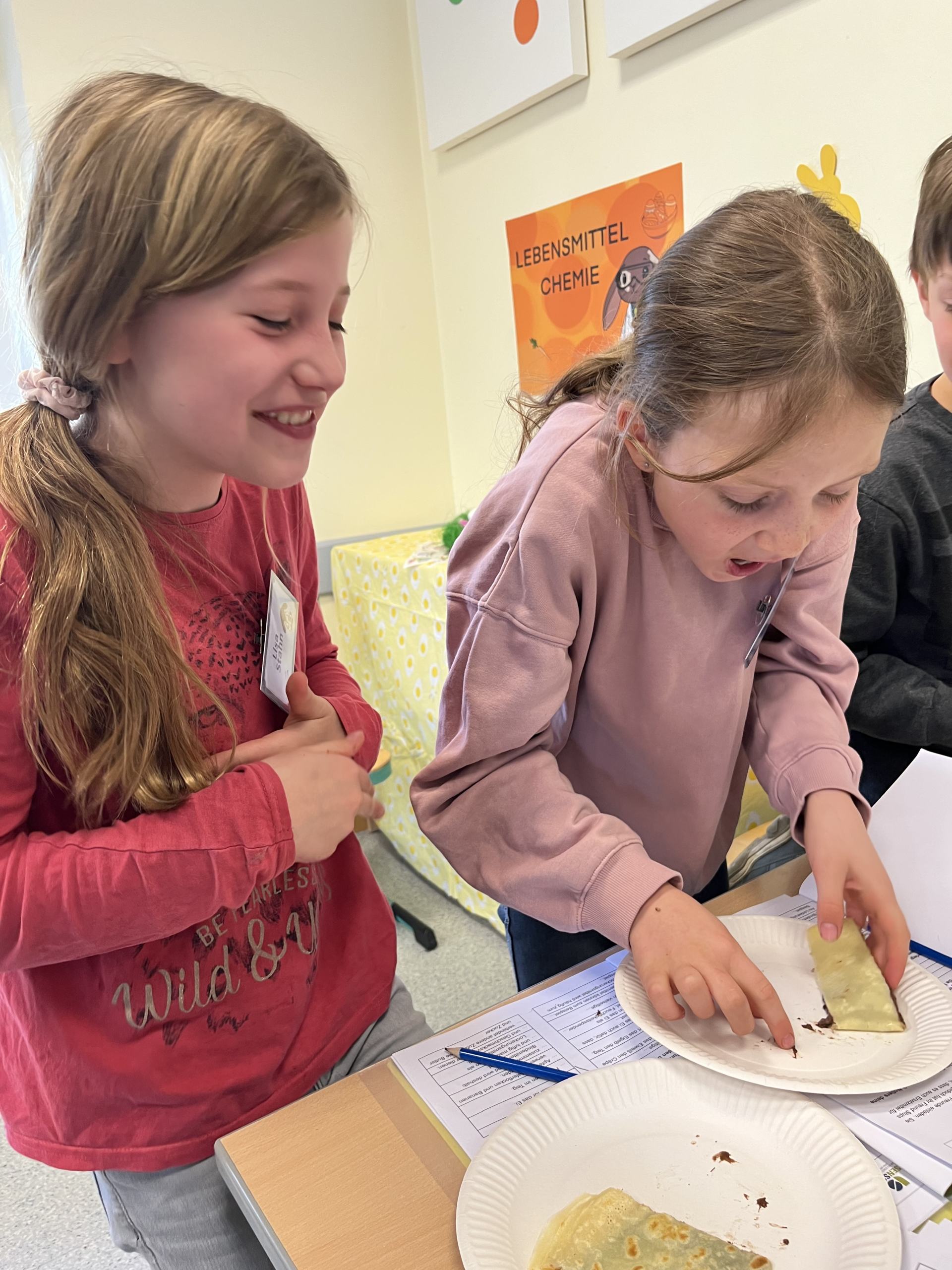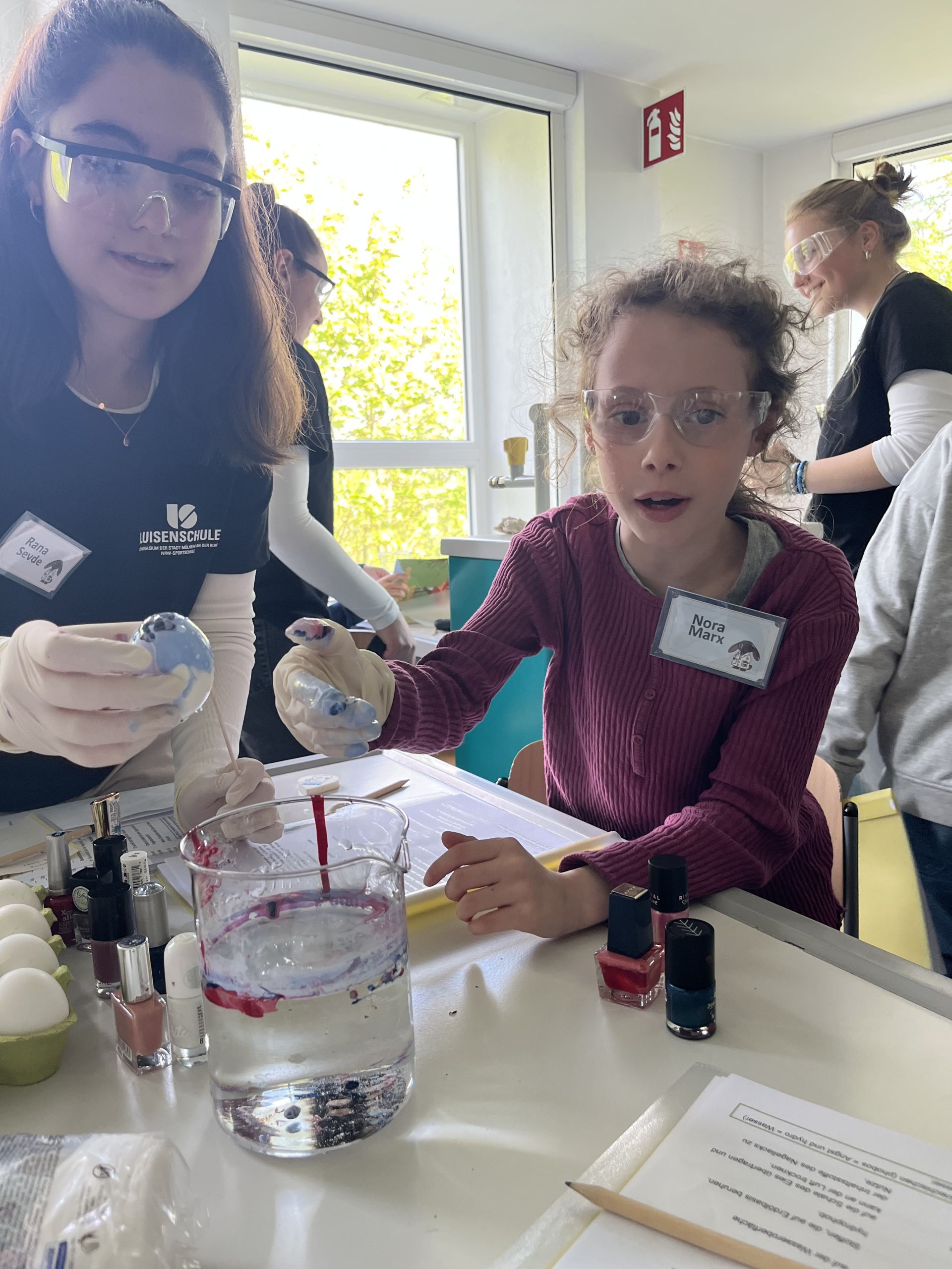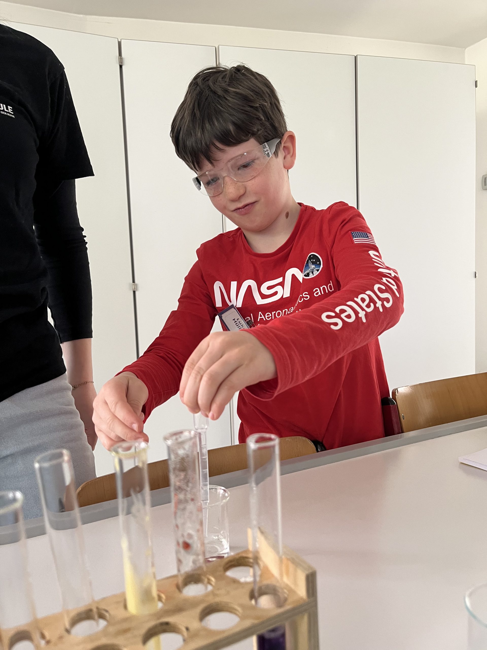 Am Montag, den 14.4.25, ging es nach einer kurzen Begrüßung, Sicherheitseinweisung um 9.00 Uhr in der Aula und einer Führung durch die Experimentalräume um 9.30 Uhr auch direkt ins erste Praktikum. Die 80 Kinder wurden dafür in fünf Gruppen aufgeteilt – jede Gruppe begab sich nun zu ihrem ersten Raum mit dem ersten Themenschwerpunkt. Es wurde geforscht, experimentiert, geknobelt, gelacht, gelernt, Spaß gehabt, nachgedacht und die MINT-Begeisterung angeregt. Wieviel hält eine Eierschale aus? Warum sind Eier nicht rund? Was passiert beim Schlagen von Eiweiß? Mit diesen Fragen und noch vielen weiteren wurde sich beschäftigt.