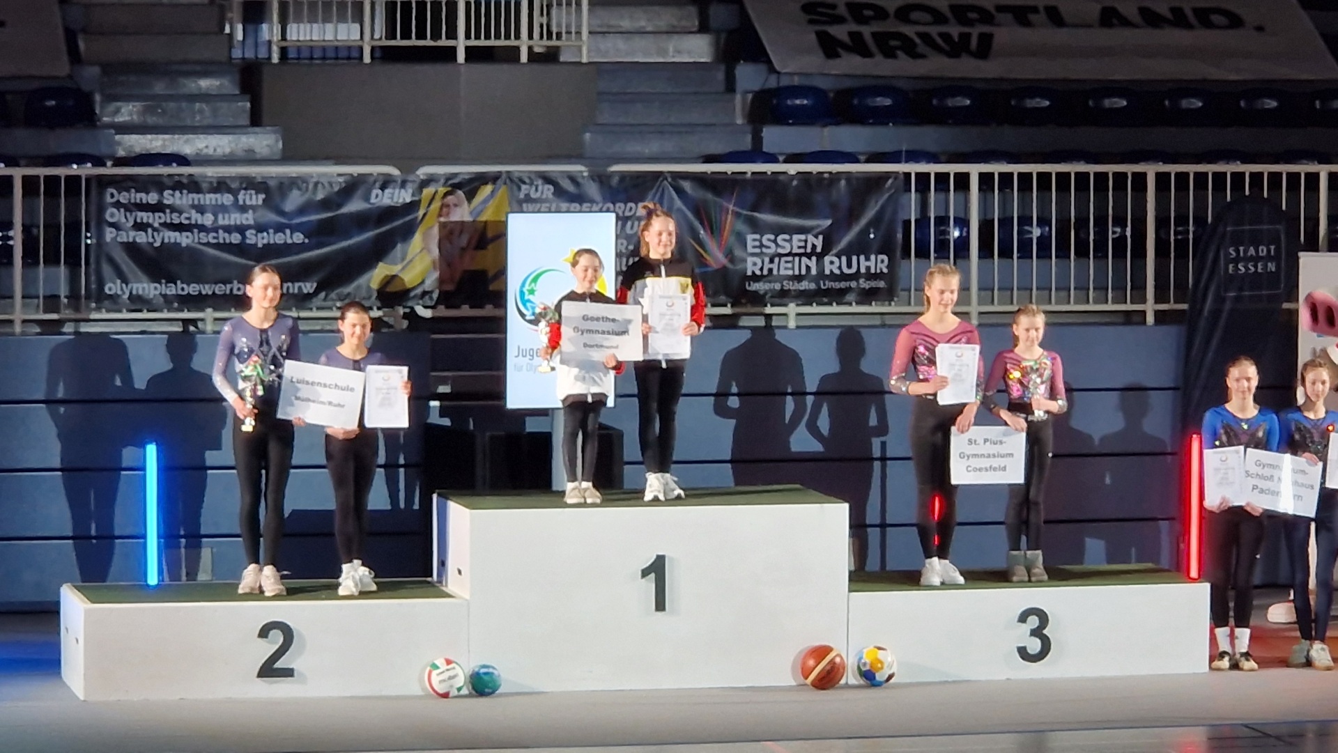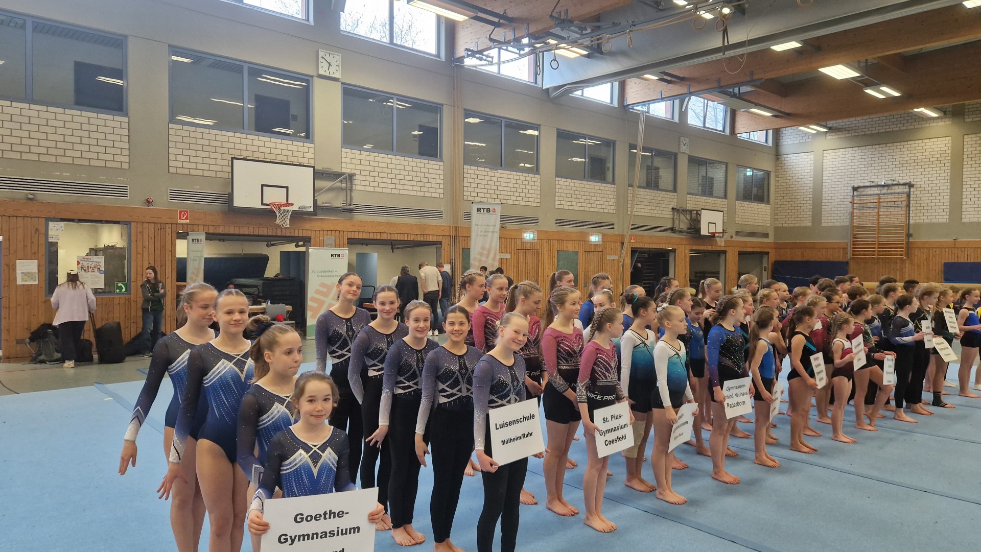 Die Turnmannschaft zeigte beeindruckende Übungen und einen großartigen Teamgeist. Am Ende wurden die Turnerinnen verdient Vize-Landesmeisterinnen. Besonders spannend: Das erstplatzierte Team vom Goethe-Gymnasium Dortmund lag in der Gesamtwertung nur einen einzigen Punkt vor unseren Turnerinnen.