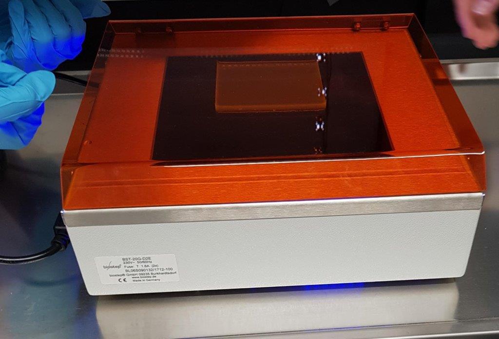 Eine Stunde später mussten wir die Gelelektrophorese vorbereiten. Hierbei waren wir nun zu viert in einer Gruppe und bauten einen Gelschlitten zusammen, in welchem wir das flüssige Agarosegel gossen. Um das Agarosegel zu erhalten, hatten wir zuvor 0,5g Agarose mit 50ml Pufferlösung gemischt und erhitzt. Erneut mussten wir 30 min warten, damit das Agarosegel aushärten konnte.