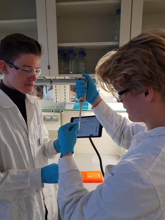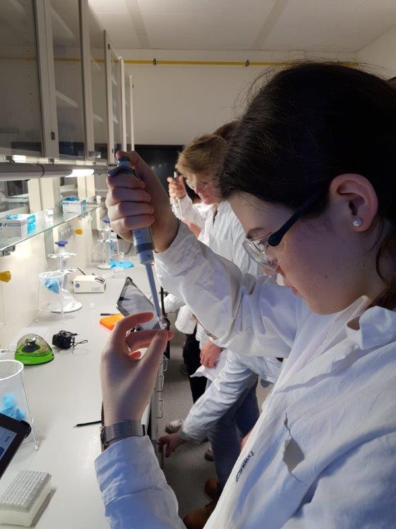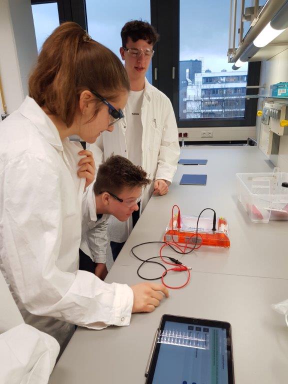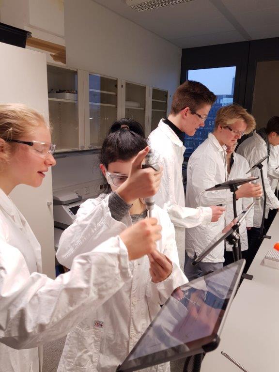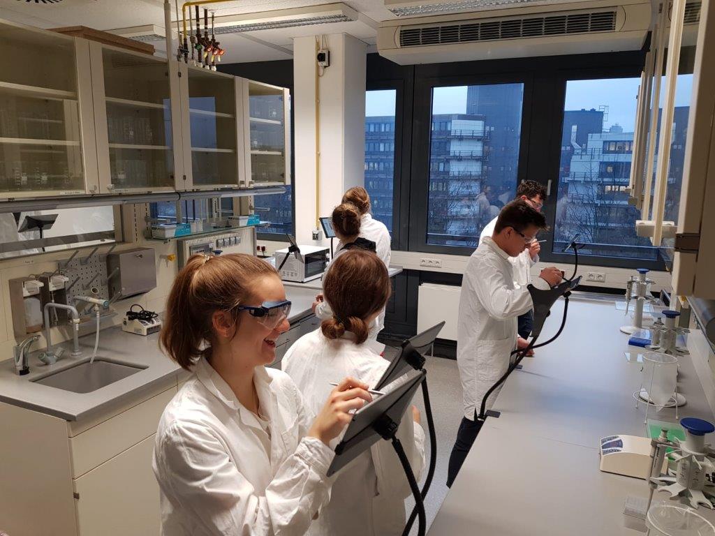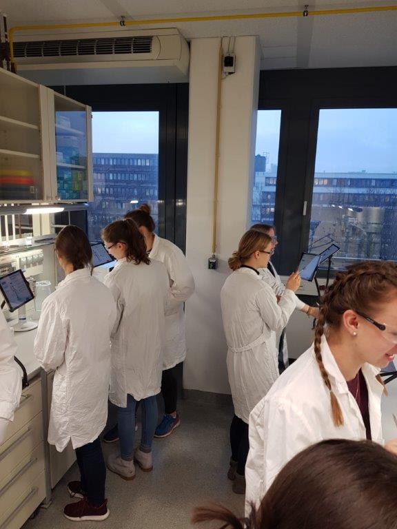 Zu Beginn erhielten wir eine Sicherheitsunterweisung. Direkt im Anschluss bekamen wir von den Lehramtsstudentinnen (für das Fach Biologie) jeweils ein Tablet sowie eine fachliche Einführung in das Thema „Nachweis von Allergenen mit PCR und Gelelektrophorese“. Danach füllten wir mit Hilfe der Tablets einen anonymen Test zum Thema aus, welches uns zeitgleich auf den nächsten Schritt im Labor vorbereitete. Wir teilten uns in Zweier Gruppen auf und sind gemeinsam ins Labor gegangen.