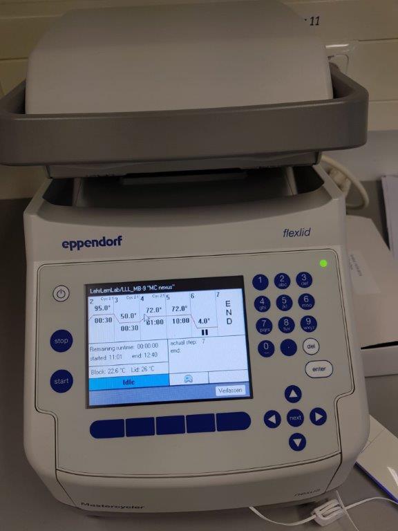 Erneut im Labor ging es nun zur Praxis über. Wir führten die PCR durch und erhielten verschiedene Proben, welche 30 min erhitzt werden mussten. Währenddessen hatten wir eine kurze Pause und befassten uns mit der Theorie zur Gelelektrophorese. In der Praxis mussten wir nun die bereitgestellten Flüssigkeiten zentrifugieren. Durch das Zentrifugieren konnten wir das Gemisch voneinander trennen. Die Reaktionsgefäße mussten nach einem bestimmten Schema mit unseren zuvor gefertigten PCR-Proben gefüllt werden. Im Anschluss wurden diese bis zu 95 Grad im Thermocycler erhitzt. Für uns gab es gegen 11:30 Uhr eine Mittagspause.