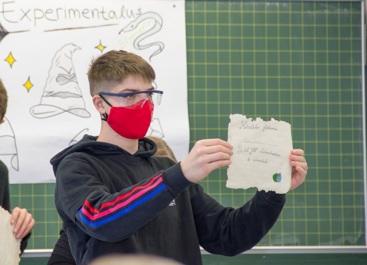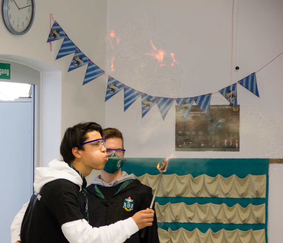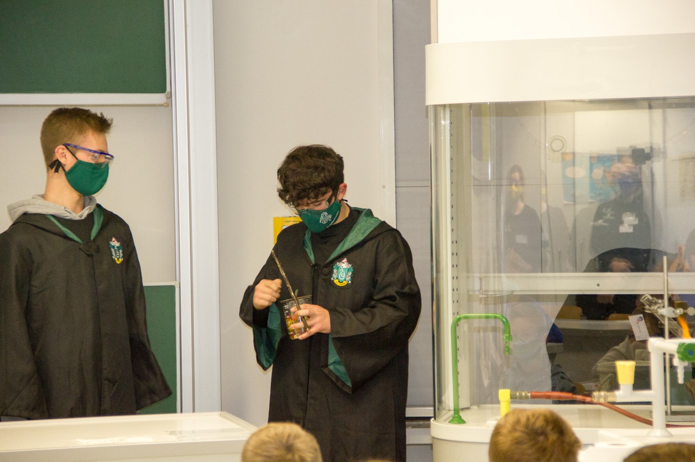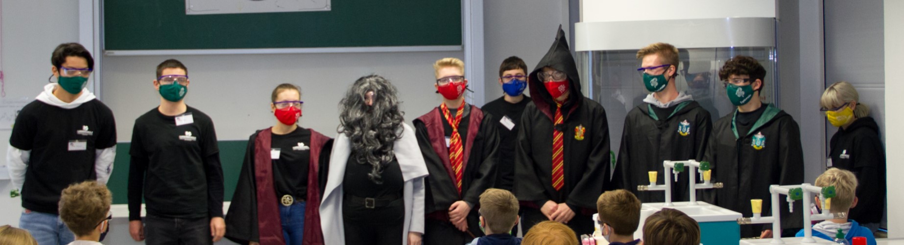 Auch dieses Jahr hat der Chemie-Projektkurs der Q1 von Frau Dr. Schulte einen Experimentiervormittag für Viertklässler vorbereitet. Immer freitags werden die Grundschulkinder für 90 Minuten in eine chemische Wunderwelt entführt. Das Thema, das sich der Projektkurs dieses Jahr ausgesucht hat, ist Harry Potter. Hierfür wurden Kostüme zusammengestellt, magische Experimente eingeübt und vorbereitet, Plakate gemalt und sogar Hogwards-Schutzmasken genäht. Wenn die Grundschüler an unserer Schule ankommen, werden sie direkt zu Beginn von Harry Potter, alias Maxim, begrüßt, der sie dann zu den Chemieräumen, in die Schule der Zauberlehrlinge, führt. Dort erwartet sie erst einmal eine selbst entwickelte, feurige Experimentalshow. Hier treten verschiedene Charaktere aus den Harry Potter-Büchern auf, die den Viertklässlern atemberaubende Experimente demonstrieren. Von Hermine und Ron über Draco, Hagrid und Prof. Snape – alles sind dabei. Unter anderem sorgen die restlos verbrennende Wolle der Feuerschafe aus Hagrids Garten und der leuchtende Tannenbaum sowie die Zahnpasta für die Hypogreifen für Begeisterung bei den Kleinen. Danach verteilen sich die Grundschulkinder auf drei Räume, um für die restliche Zeit unter unserer Anleitung selbst zu experimentieren. Bei den Räumen handelt es sich um unsere zwei Chemieräume und um eine geheimnisvolle Dunkelkammer. In diesen Räumen finden die Viertklässler eine Vielzahl unterschiedlicher Experimente vor. Hier können die Kinder beispielsweise Wunderkerzen, Geheimschriften, Raketen, Vulkane, magische Zaubertränke und -pulver und noch vieles mehr selbst machen und entdecken. Zu jedem Experiment wurden Arbeitsblätter vorbereitet, die eine Geschichte rund um Harry und seine Freunde, kleine Aufgaben für die Schüler und eine Erklärung für das jeweilige Experiment enthalten. Die Grundschüler können am Ende des Zauberlehrgangs ihren vom Projektkurs vorbereiteten Hefter mit den Arbeitsblättern mit nach Hause nehmen. Zum Abschluss werden ihnen noch Urkunden ausgehändigt, die sie als Meisterzauberer ausweisen. Außerdem bekommen sie noch eine kleine Überraschung überreicht, aber mehr wird nicht verraten.