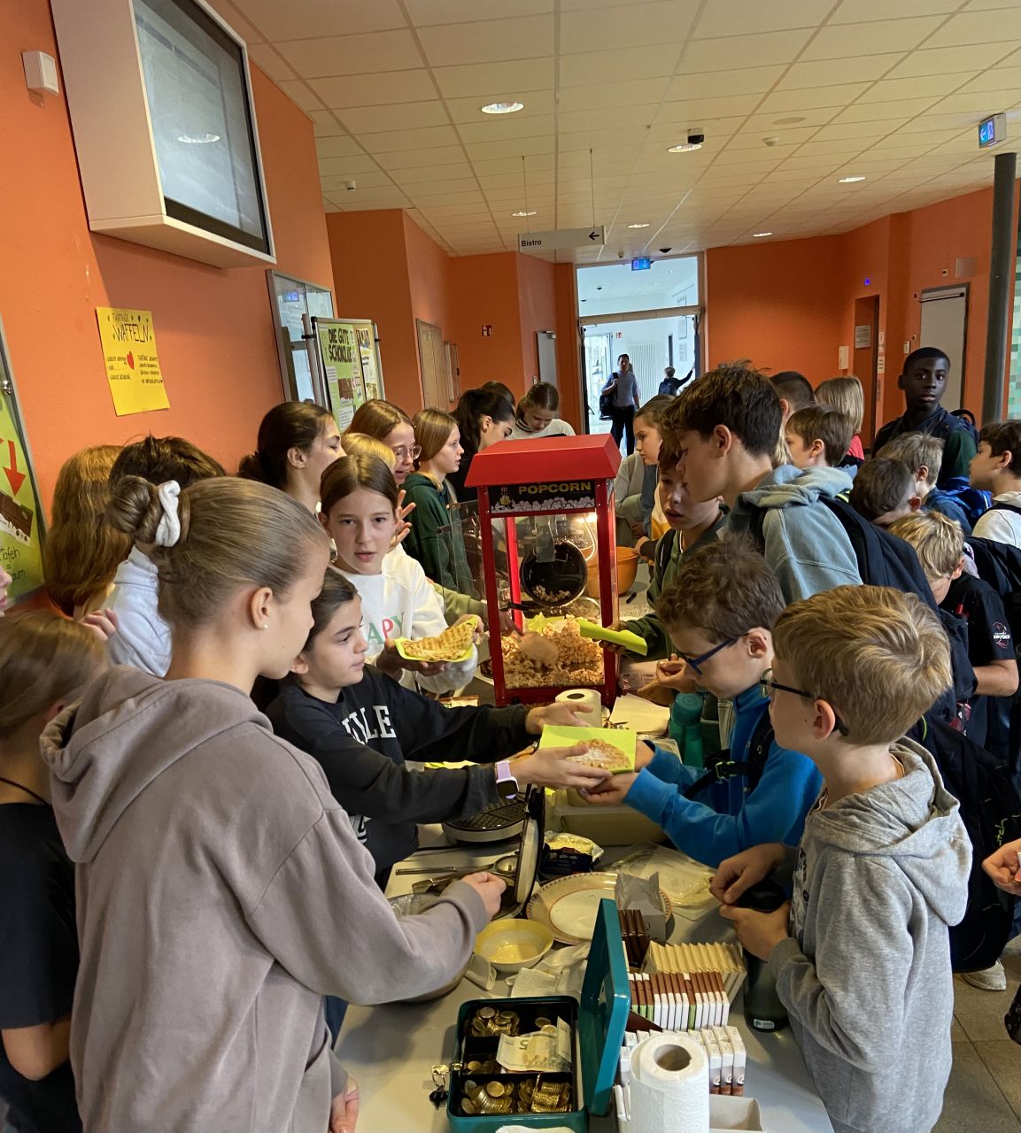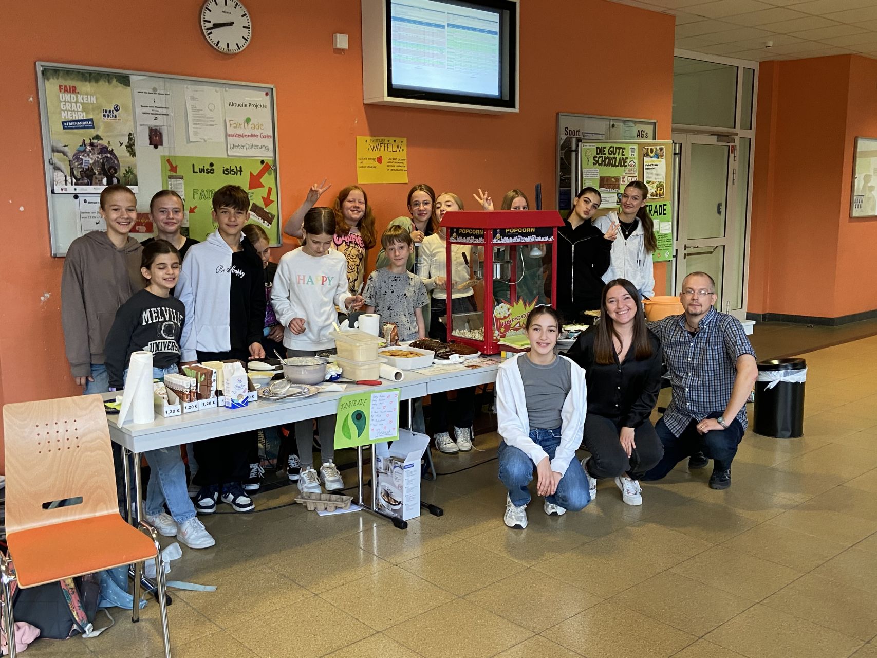 Passend zum Kino hat die Umwelt AG (selbstgemachte) faire Snacks und Produkte verkauft. Die Auswahl war groß. Verkauft wurden Bananenbrot aus fairen Bananen, Cookies aus fairer Schokolade, Popcorn und Crêpes sowie Kuchen mit fairem Zucker, die faire „gute Schokolade“ und faire Adventskalender. Während die Schülerinnen und Schüler die Leckereien genossen, konnten sie sich an den Infoständen über den fairen Handel informieren – die Umwelt AG hat im Vorfeld aufschlussreiche Plakate erstellt.