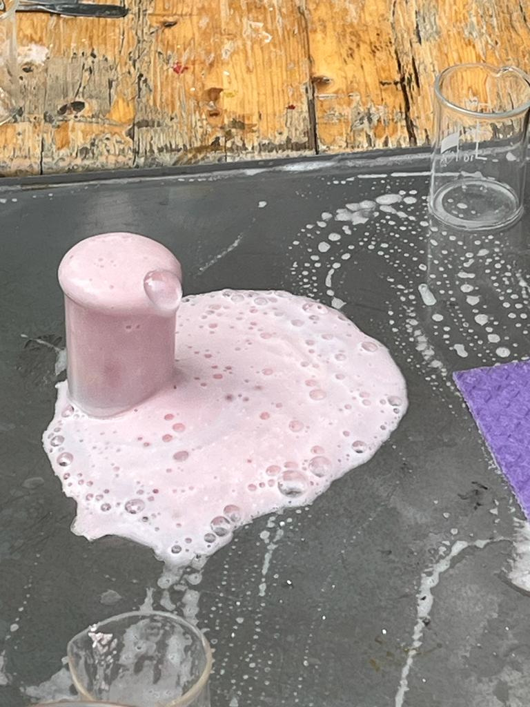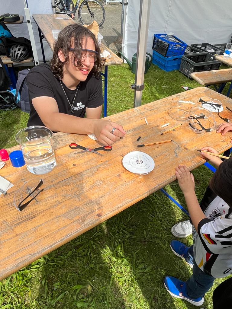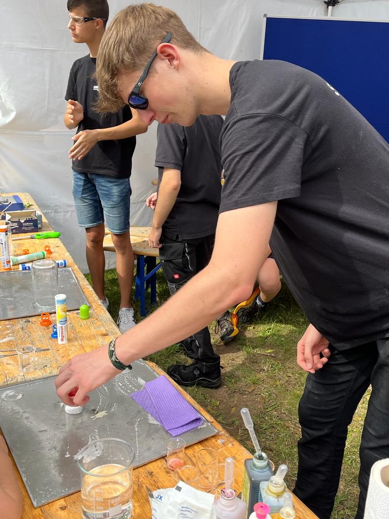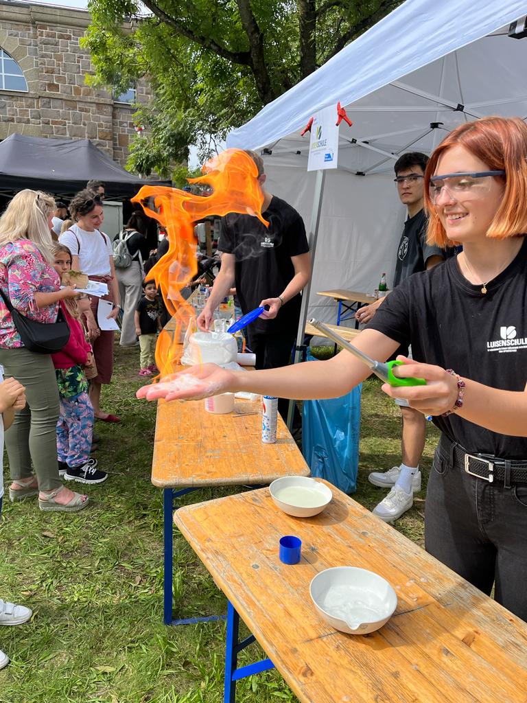 Die Schülerinnen und Schüler des ehemaligen MINT-Projektkurses der letzten 01, bestehend aus Charlotte, Nils, Niklas, Tom, Mark, Hannah, Jennifer, Priscilla, Muriella und der engagierten Unterstützung von Nepomuk erkundeten unter der Leitung von Frau Dr. Schulte mit den Besuchern auf besonders spektakuläre Weise die Welt der Chemie: Sie bauten brodelnde Vulkane, entflammten Seife und zündeten Raketen mit den Kindern, was bei den kleinen Besuchern für große Begeisterung sorgte. Sogar Danilo, der die Schule bereits verlassen hatte, unterstützte die Aktion tatkräftig.