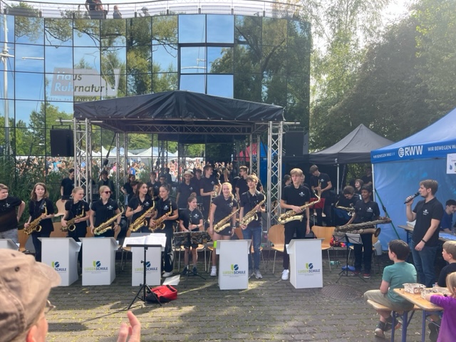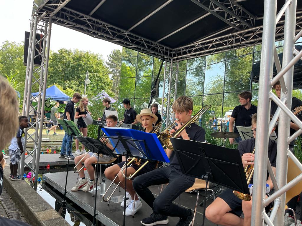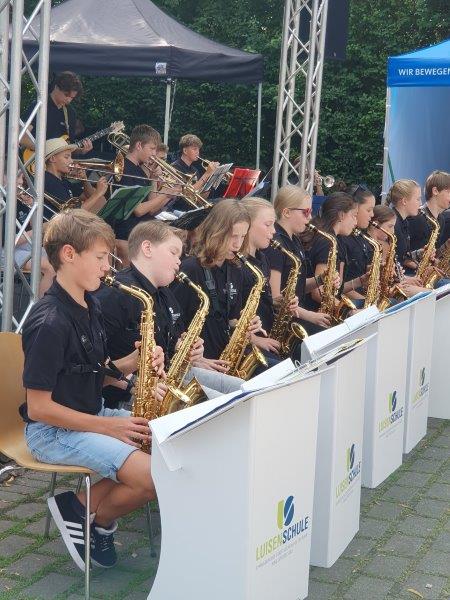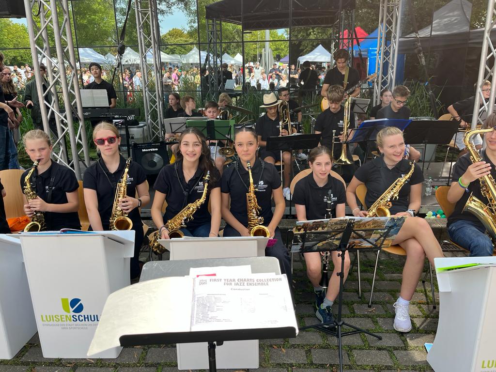 Herr Küssner und seine Junioren" hatten ein buntes Set aus Jazz, Rock, Pop, Latin, und Filmmusik mitgebracht, was für beste Laune sorgte Unterstützt wurden sie dabei von ehemaligen und aktuellen Mitgliedern der "großen" Bigband der Luisenschule. Als Solisten traten Nele (9c), Thilo (10b), Jorin (10b) und Anton (10b) auf - zum ersten Mal präsentierten ihre Soli Gabriel (6a) und Sascha (7c) dem Publikum. Der Auftritt wurde mit viel Applaus belohnt, sodass sich nun alle schon darauf freuen, diese gute Tradition beim nächsten Fest auf der Schleuseninsel fortzuführen.