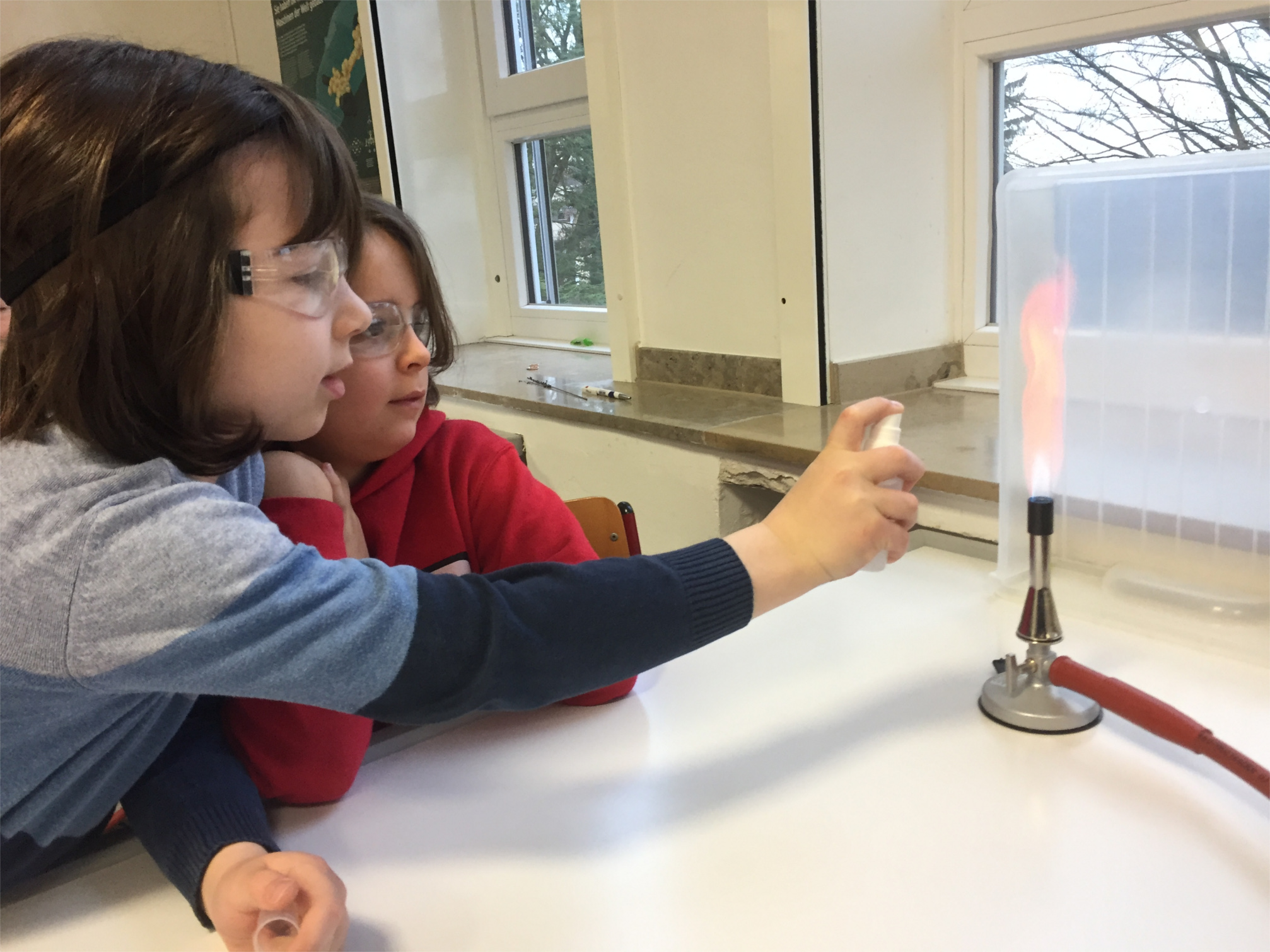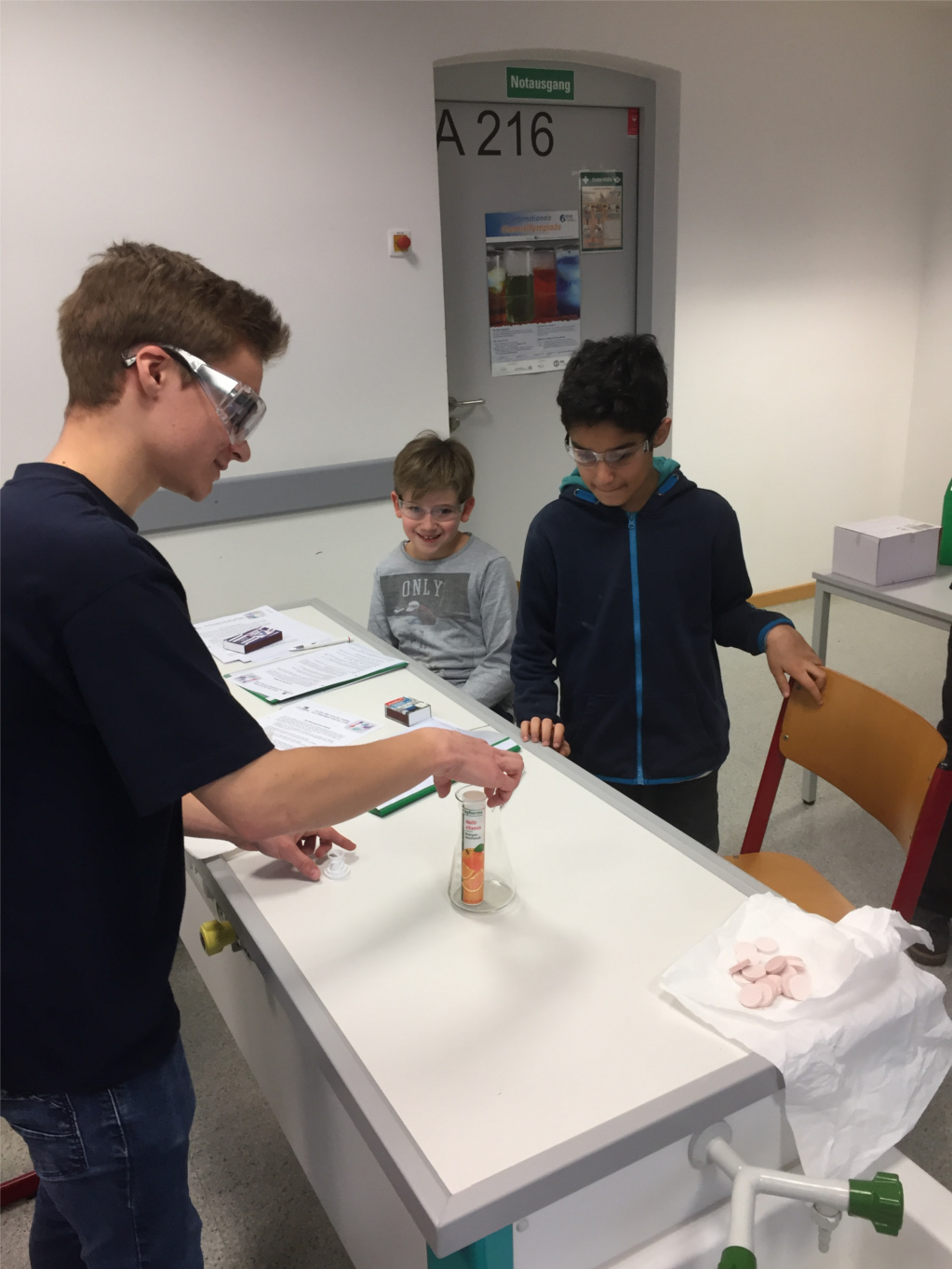 Es hat wirklich Spaß gemacht mit den Kindern zu arbeiten, und zwar besonders, weil sie mit voller Begeisterung dabei waren. Denn nicht nur die großen Experimente, die von uns Schülerinnen und Schülern vorgeführt wurden, haben für Faszination gesorgt, sondern vor allem das selbstständige Experimentieren hat den Kindern am meisten Spaß gemacht. Sie waren ehrgeizig dabei alles auszuprobieren und allerlei Fragen zu stellen. Die Kinder konnten zum Beispiel Schießwatte selbst anzünden, die daraufhin in einer kleinen Explosion verschwand, welches für Erstaunen sorgte, sodass jedes Kind die Schießwatte am liebsten mehrmals selbst anzünden wollte. Außerdem konnten die Kinder Wunderkerzen selbst herstellen, wobei sie Handschuhe tragen mussten und eine ziemliche Matscherei veranstalten konnten, was ihnen sehr gefallen hat. An einer anderen Station konnten sie Brause- und Teebeutelraketen selbst basteln und ausprobieren, welches den Kindern ebenfalls viel Spaß gemacht.