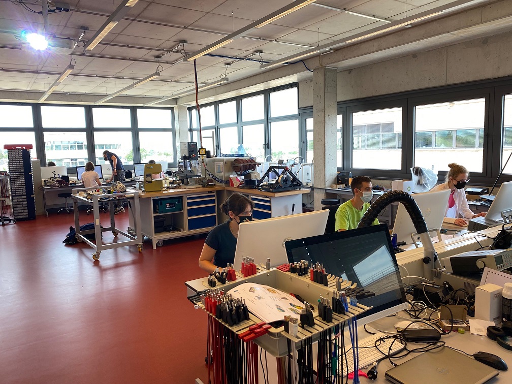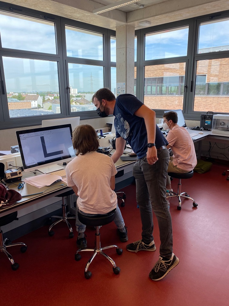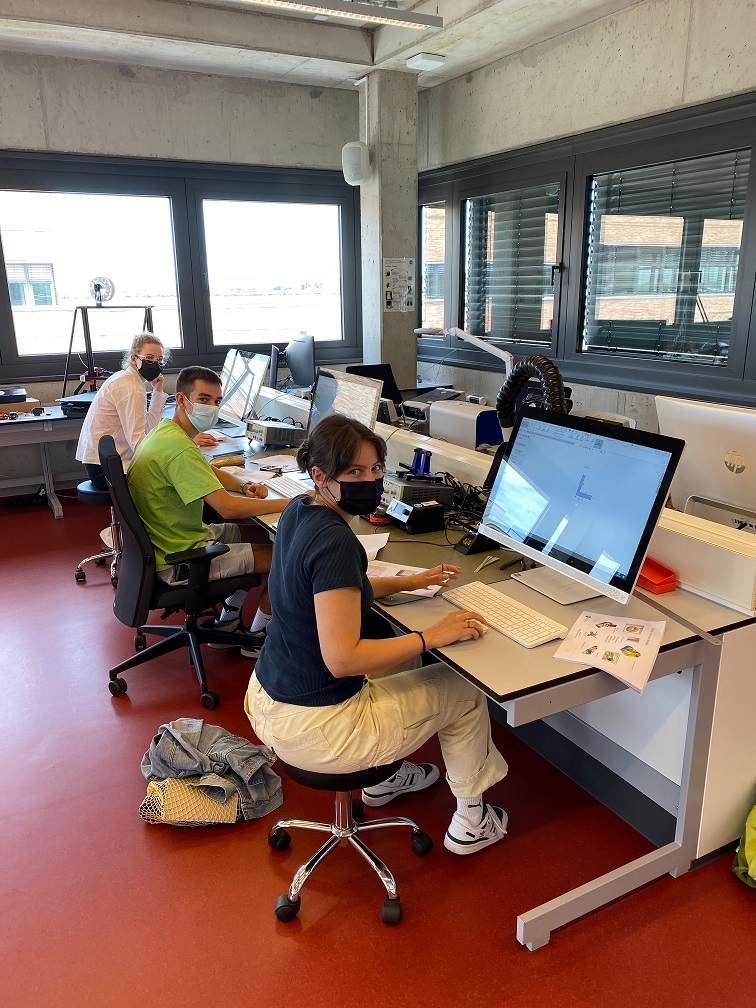 Am Mittwoch waren wir fast schon Profis in der CAD-Konstruktion und es ging ans tatsächliche Drucken. Herr Auder erklärte uns, was es bezüglich der Materialien (Filamente), der Temperaturen, der Düsen und der Bedienung des Druckers generell zu bedenken gibt. Die Skizzen aus dem CAD-Programm wurden auf das Druck-Programm übertragen und nach ein wenig Formatierung (z.B. von Support/Stützmaterial) begann der Druckvorgang. Weil dieser allerdings länger dauerte als unser Aufenthalt geplant war, beendeten wir den Kurs am Nachmittag mit einer Führung durchs Institut für Maschinenbau an der HRW. Herr Auder zeigte uns zunächst einen wissenschaftlichen Arbeitsraum mit SLS- (Kunststoffpulver) und SLA-Druckern (Harz). Wir konnten sogar per Liveaufnahme den Druckvorgang im Inneren des abgeriegelten SLS-Drucker beobachten. Danach ging es zur Fahrzeugtechnik, wo Studierende an einem selbstentwickelten Rennwagen für die Formula Student tüftelten. Zuletzt besichtigten wir noch einen SLS-Drucker, welcher mit Stahlpulver arbeite, und einen „mega“ 3D-Drucker, ein Roboterarm, der mittels verschiedener Aufsätze für verschiedene Anwendungen benutzt werden konnte und räumlich nicht begrenzt war – sehr beeindruckend!