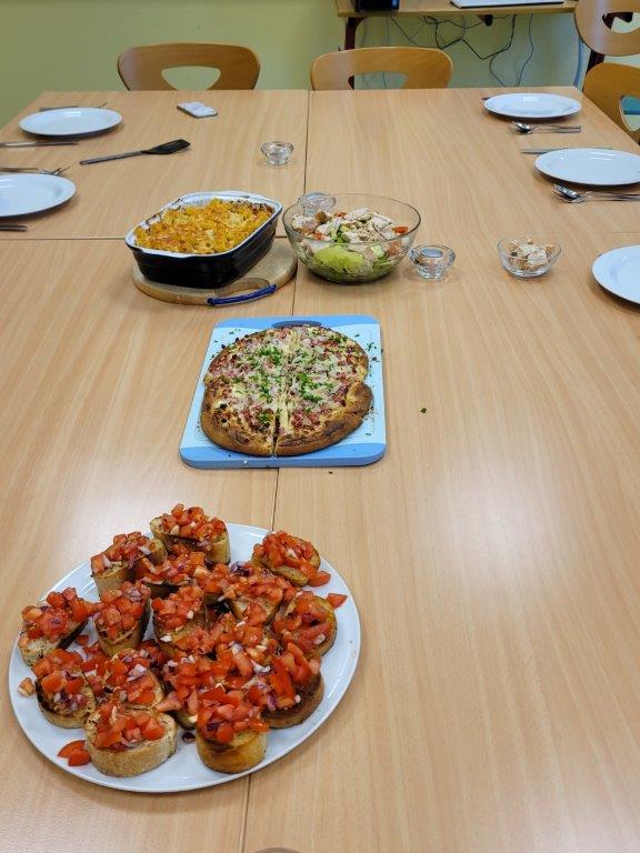 Die Schüler:innen der Jahrgangsstufe 9 kochen jeden Montag an ihrem Langtag von ca. 13:00 - 15:30 Uhr. Die Gerichte dürfen die Gruppen aussuchen und Lebensmittel vorbereiten. Vorort unterstützt ihr Lehrer Herr Durmuş. Es wird an vier Kochinseln gearbeitet, die nachher so hinterlassen werden, wie sie vorgefunden wurden, denn Hygiene ist sehr wichtig. Die Arbeitszeit beträgt ungefähr 45 Minuten, in denen Gerichte wie Flammkuchen, Nudelauflauf oder Bruschetta etc. zubereitet werden. Am Ende essen alle zusammen und besprechen zukünftige Essenspläne.