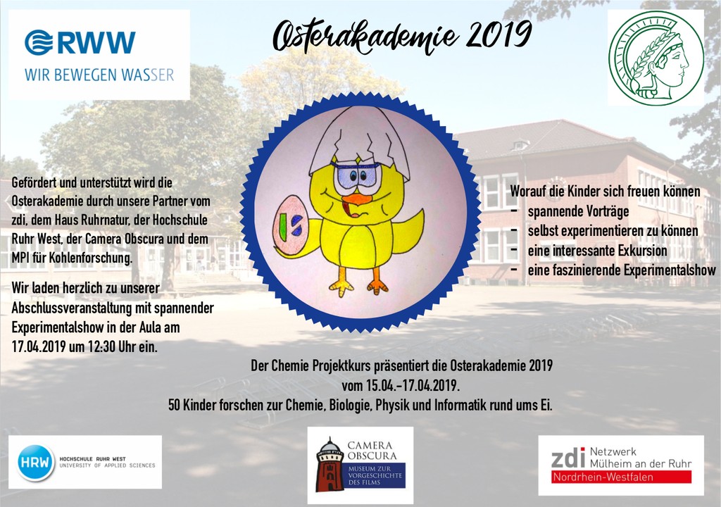 Wir laden herzlich zu unserer Abschlussveranstaltung mit spannender Experimentalshow in der Aula am 17.04.2019 um 12:30 Uhr ein. Der Chemie-Projektkurs präsentiert die Osterakademie 2019 vom 15.04. bis 17.04.2019. 50 Kinder forschen dann zur Chemie, Biologie, Physik und Informatik rund ums Ei.