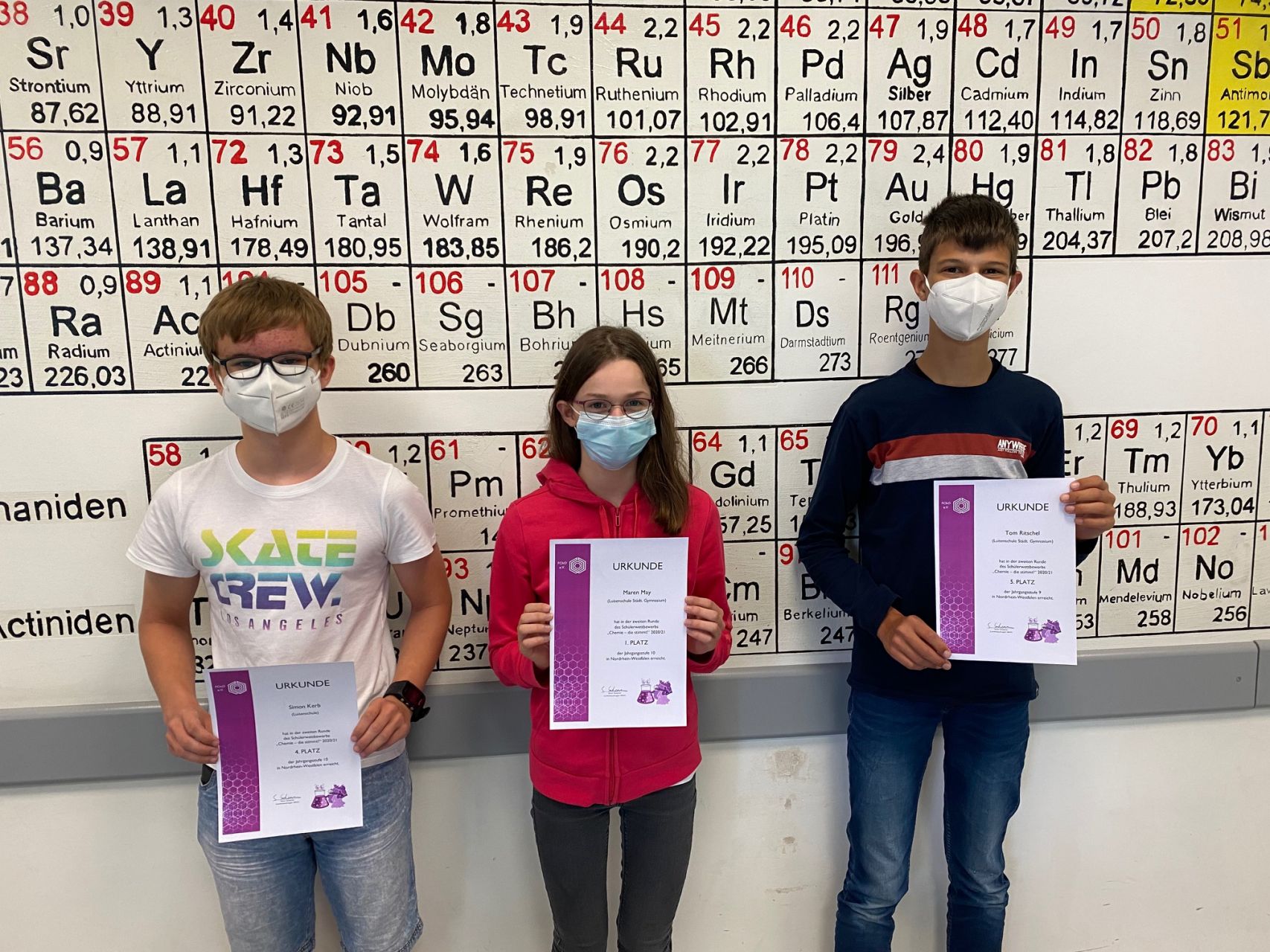 Tom Ritschel schaffte es in der Jahrgangsstufe 9 Gruppe West auf den vierten Platz. Simon Kerb belegte in der Jahrgangsstufe 10 Gruppe West den achten Platz hinter Maren May auf Rang zwei. Als Wiederholungstäterin konnte sich Maren May damit, wie schon im Vorjahr, für das Finale im September qualifizieren. Damit erhält sie gleichzeitig auch die Eintrittskarte für den Einstieg in die zweite Runde der Internationalen Chemieolympiade. Wir gratulieren allen Teilnehmern zu diesem tollen Erfolg.