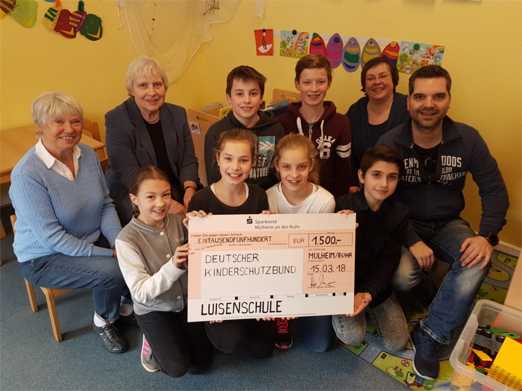 Am Donnerstag, den 15.03.2018, besuchten sechs Schülerinnen und Schüler der Klasse 6d mit ihrem Klassenlehrer Herrn Krause den Kinderschutzbund in der Mülheimer Innenstadt. Dort überreichten sie den Mitarbeiterinnen ihre Spende in Höhe von 1.500,- € in Form eines Schecks.