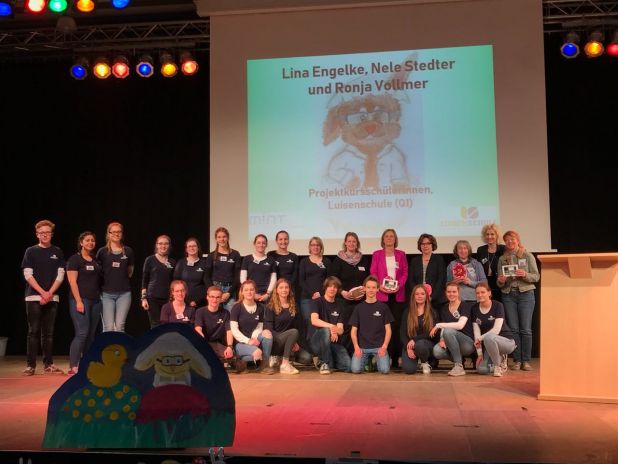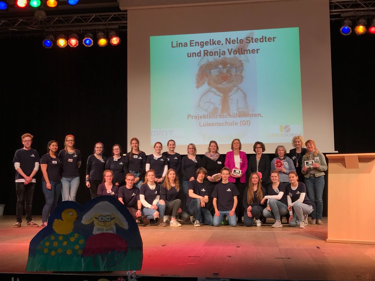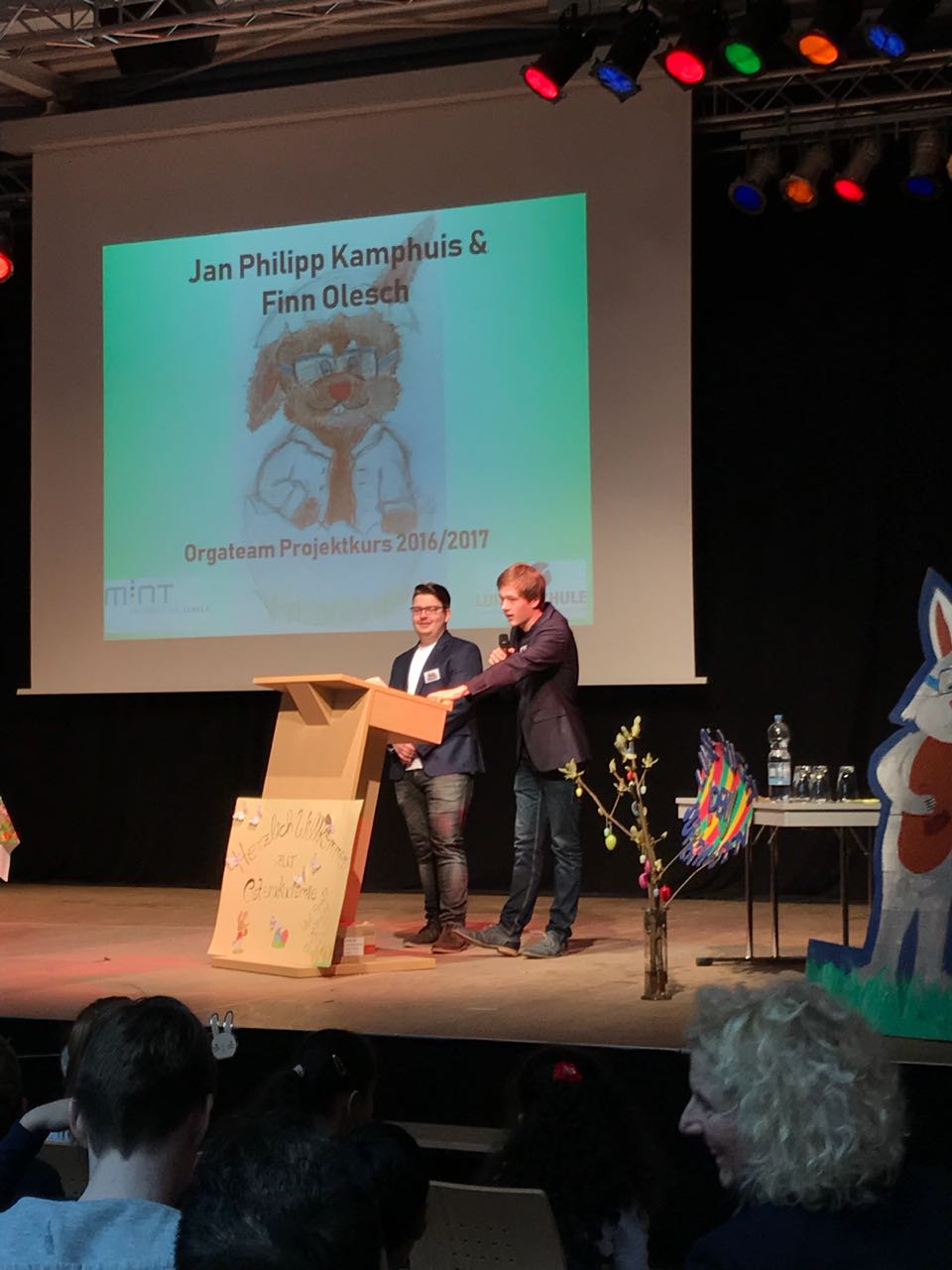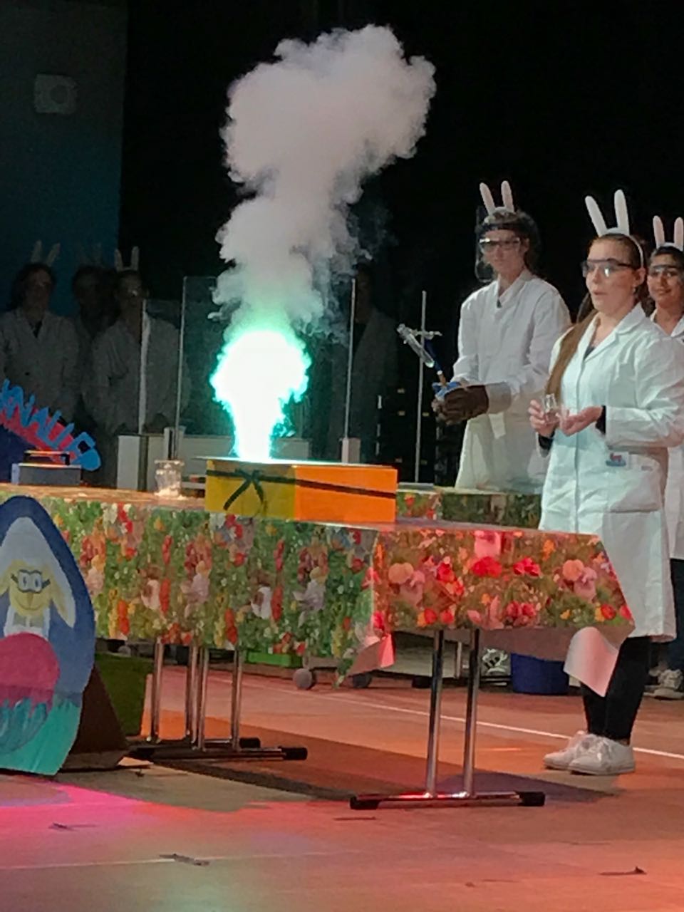 Abgerundet wurde diese Veranstaltung und somit auch die Osterakademie durch unsere eigens kreierte Experimentalshow „Luise sucht den Superhasen“, in der wir anhand von herausragenden Experimenten den besten Osterhasen des Jahres suchten. Besonders stachen die eindrucksvollen Experimente, wie z.B. die „Bunte Reihe“, die „Hölle des Gummieis“ und die „Elefantenzahnpasta“ hervor. Zudem auch noch das zauberhafte Bühnenbild. Das alles war das Resultat von langer und engagierter Zusammenarbeit des gesamten Projektkurses.