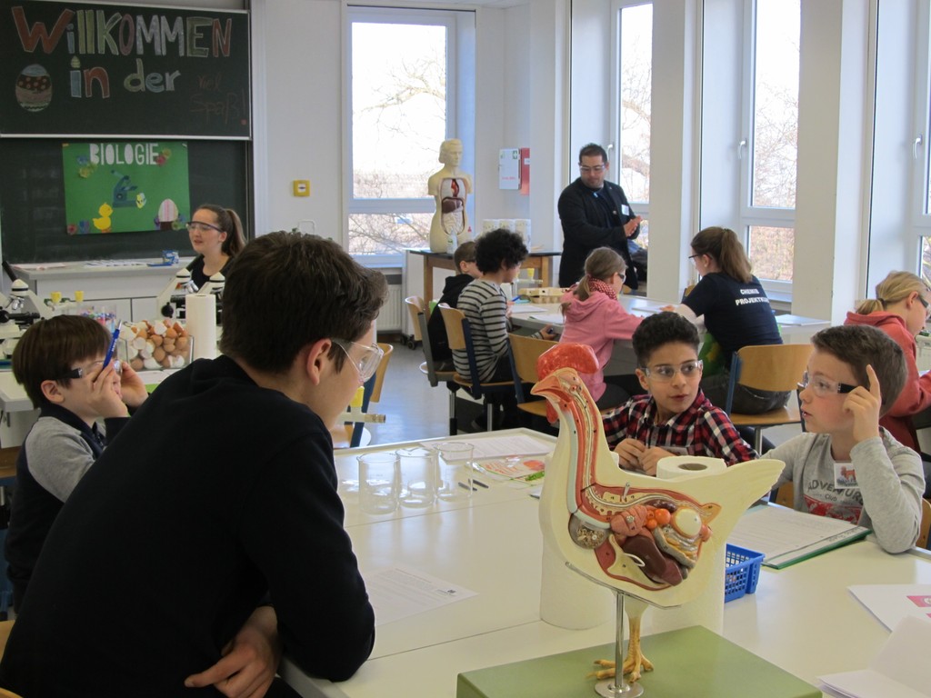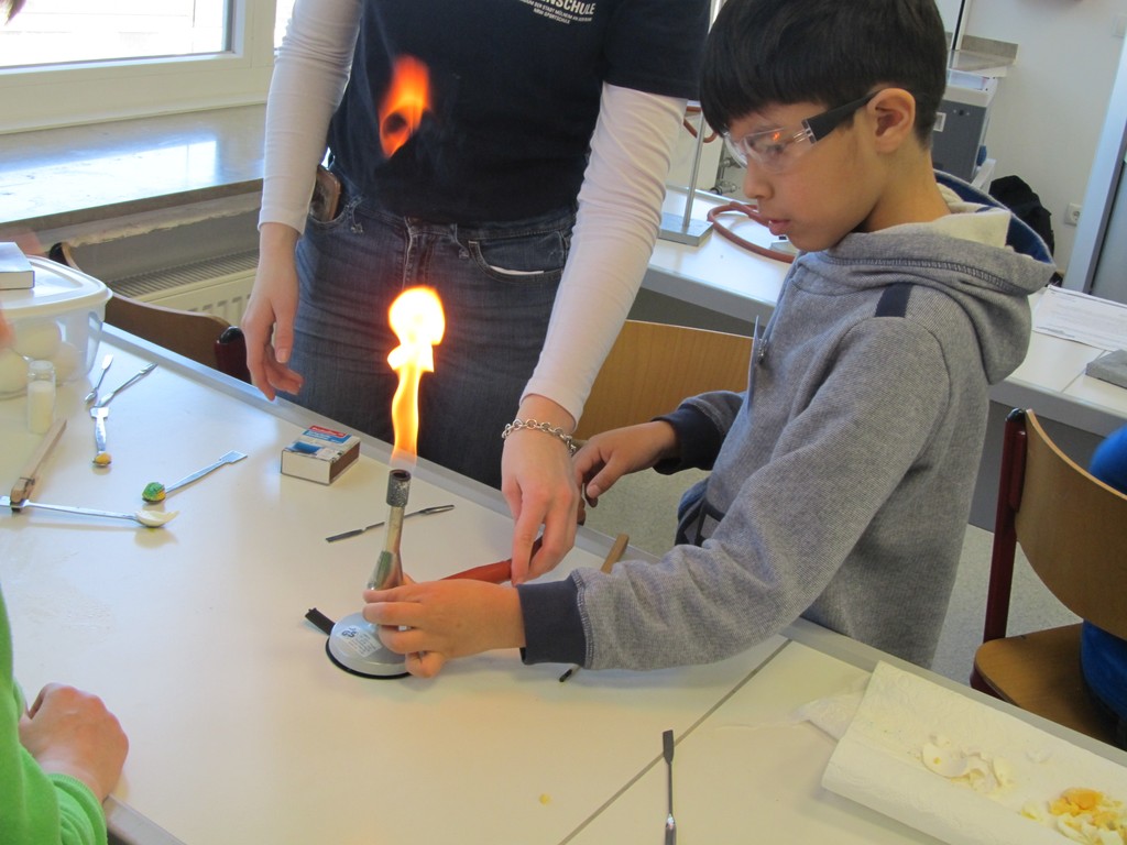 Innerhalb dieser drei Tage absolvierten die Kinder fünf Experimentalpraktika, bei denen sie selber mitdenken und mitforschen sollten. DerReihe nach besuchten sie unsere fünf Experimentalräume - die Chemieräume I & II, den Physikraum, den Biologieraum und den Lebensmittelraum – in denen sie dann Experimente rund um das Ei ausprobieren konnten. So erfuhren sie z.B., dass man statt Ei auch Apfelmus in den Pfannkuchen rühren kann, wenn man eine Eiallergie hat. In der Biologie fanden sie unter anderem heraus, dass eine halbe Eierschale 11 schwere Biobücher tragen kann. Das war natürlich nur ein kleiner Teil der Überraschungen, die es in allen Räumen zu bestaunen gab.