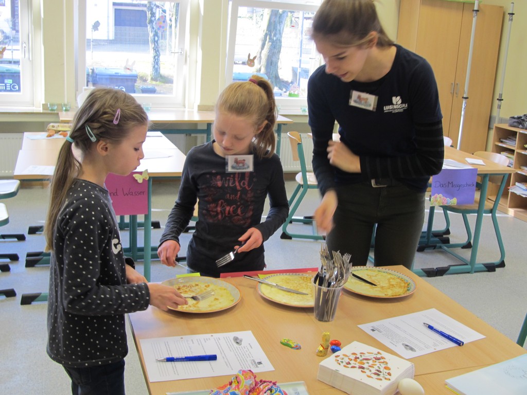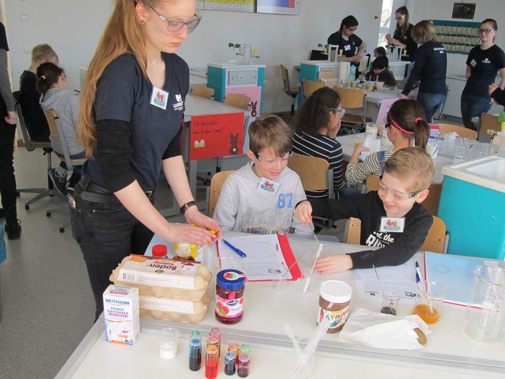 In den Osterferien war´s wieder soweit: die Osterakademie ging in die zweite Runde. Erneut hatten ausgewählte Drittklässler der Mülheimer Grundschulen die Möglichkeit in der Luisenschule selber rund ums Thema Ei zu experimentieren. Dieses Mal waren vom 26.03. bis zum 28.03.2018 50 Kinder von 10 Grundschulen dabei. Angeleitet wurden sie dabei von uns, den Schülern des Chemie Projektkurses 2017/2018von Frau Dr. Schulte, und vielen fleißigen Helfern aus den Jahrgangsstufen 8 bis 12. Was bewirkt das Ei in Lebensmitteln? Was hat das Ei für eine Funktion in der Natur? Wie stabil ist es? Und was hat es mit den Eierfarben auf sich? Diese zentralen Fragen beleuchteten wir aus chemischer, physikalischer, biologischer und lebensmittel-chemischer Sicht.