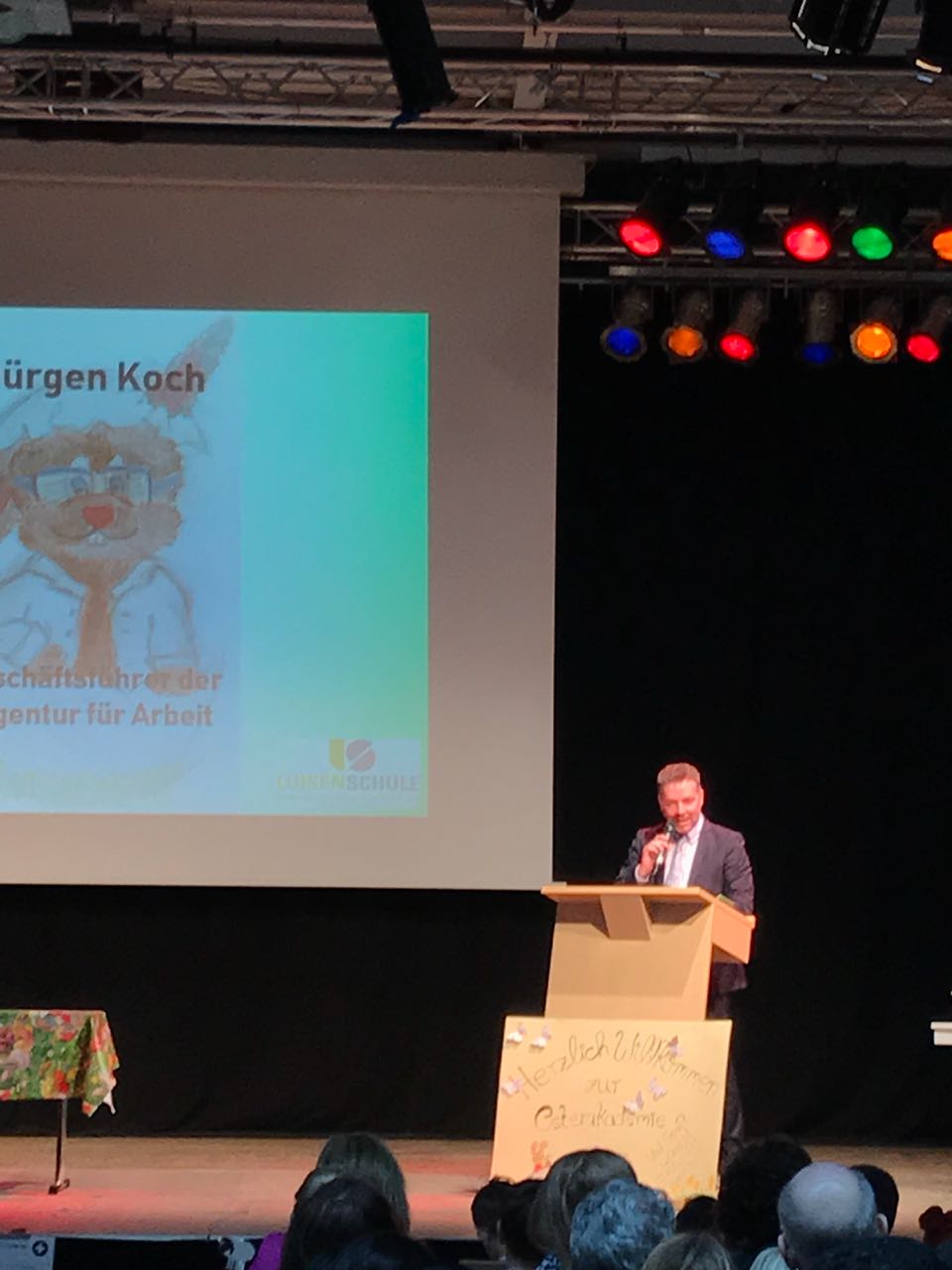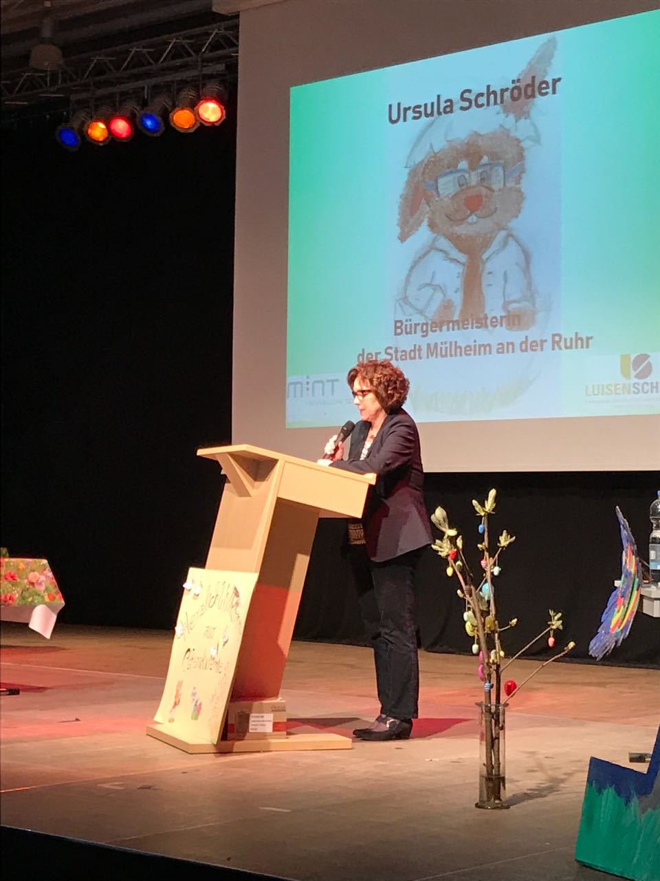 Auf unserer Abschlussveranstaltung sprachen die stellvertretende Bürgermeisterin Mülheims, Ursula Schröder, der Geschäftsführer der Agentur für Arbeit, Jürgen Koch, und unsere Ansprechpartnerin des zdi-Netzwerks Mülheim, Monika Bruckmann, Grußworte. Und natürlich waren auch die alten Hasen des letzten Projektkurses dabei. Viele haben schon im Vorfeld fleißig mitgeholfen und waren nun gekommen, um unsere Abschlussveranstaltung – insbesondere unsere Experimentalshow zu sehen und Finn und Jan Philipp haben ebenfalls einige charmante Grußworte gesprochen.