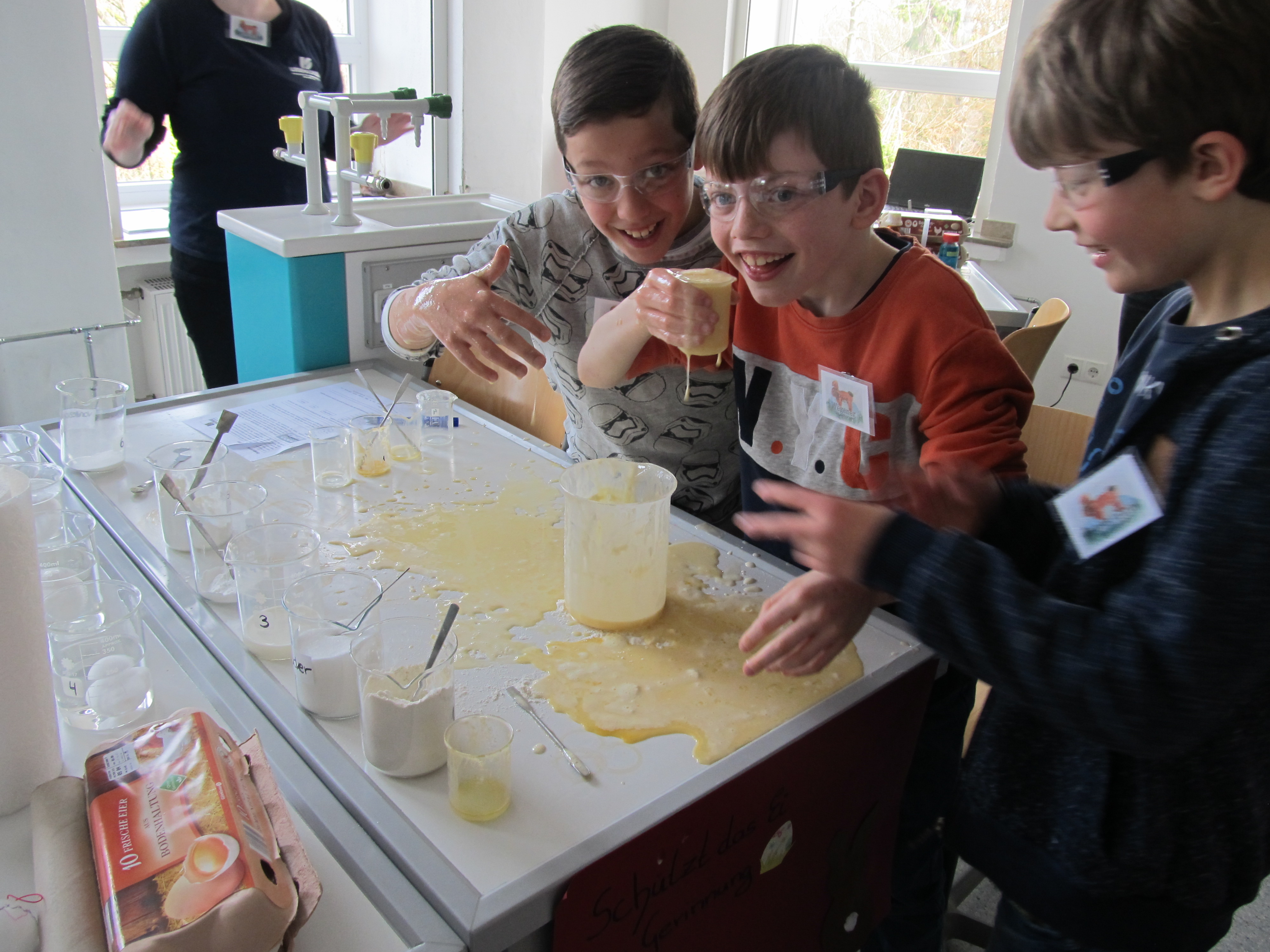 Innerhalb dieser drei Tage absolvierten die Kinder fünf Experimentalpraktika, bei denen sie selber mitdenken und mitforschen sollten. DerReihe nach besuchten sie unsere fünf Experimentalräume - die Chemieräume I & II, den Physikraum, den Biologieraum und den Lebensmittelraum – in denen sie dann Experimente rund um das Ei ausprobieren konnten. So erfuhren sie z.B., dass man statt Ei auch Apfelmus in den Pfannkuchen rühren kann, wenn man eine Eiallergie hat. In der Biologie fanden sie unter anderem heraus, dass eine halbe Eierschale 11 schwere Biobücher tragen kann. Das war natürlich nur ein kleiner Teil der Überraschungen, die es in allen Räumen zu bestaunen gab.