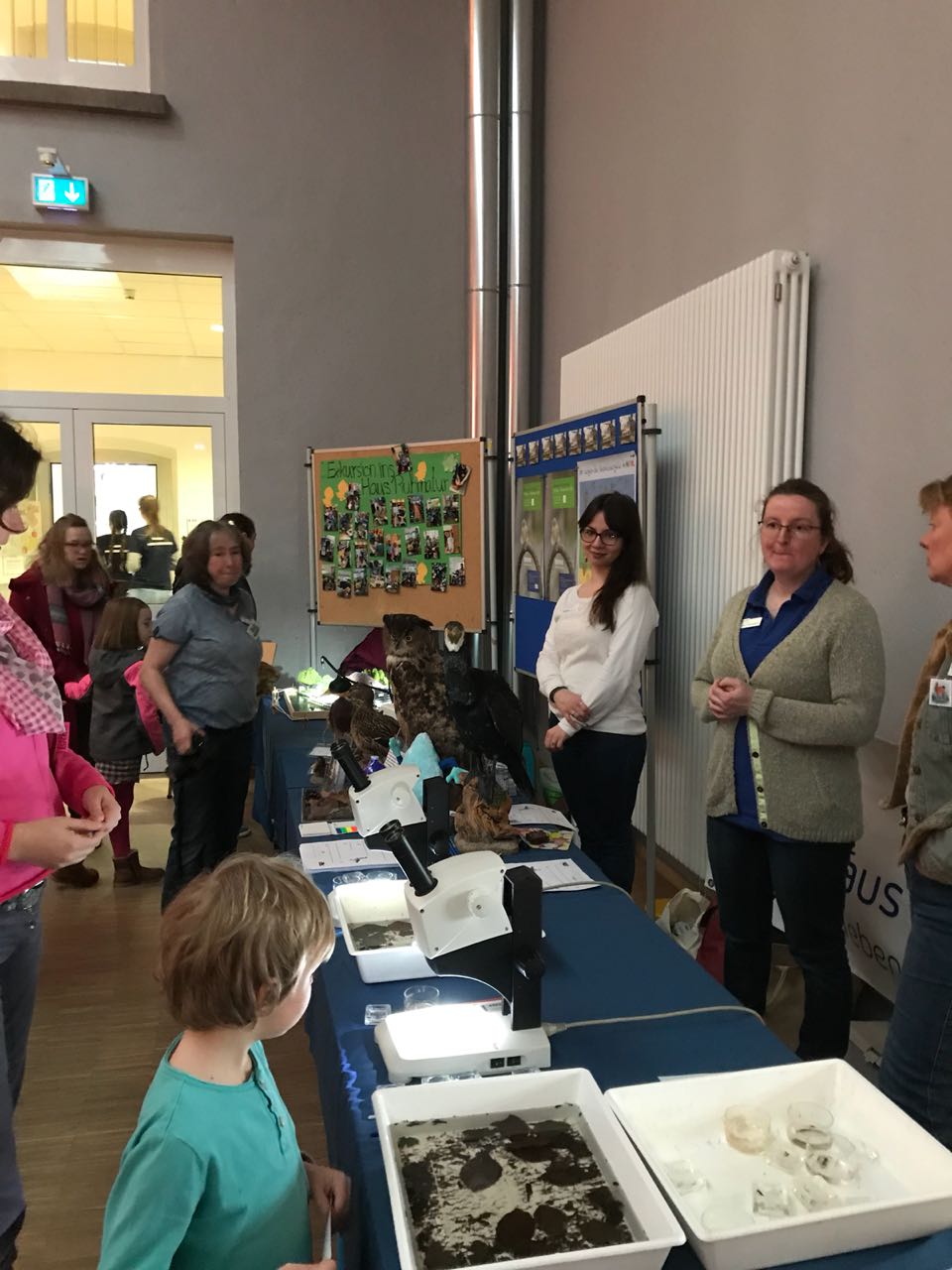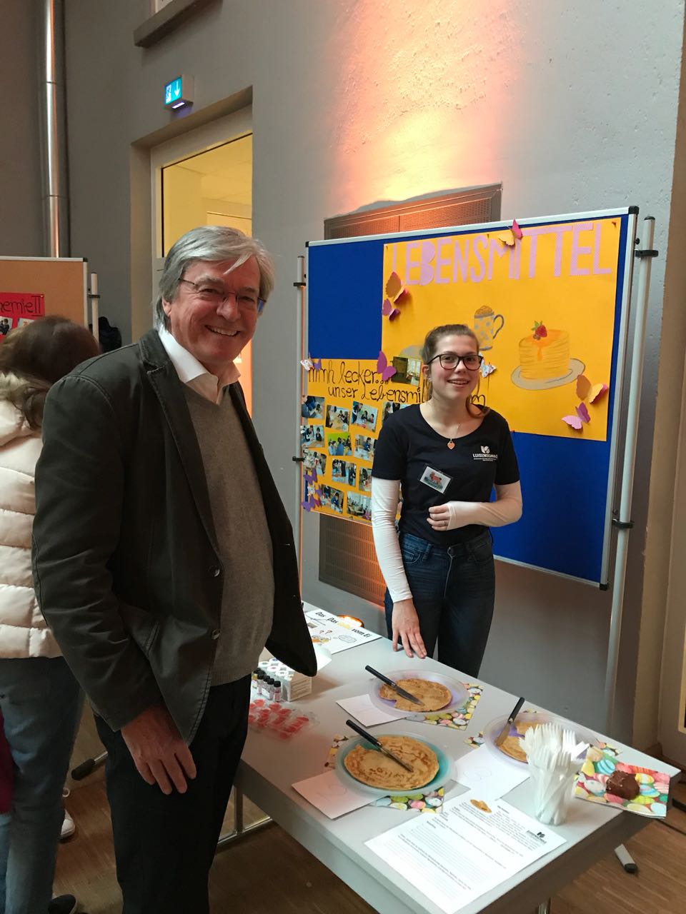 Die Abschlussveranstaltung setzte sich nicht nur aus spannenden Reden und einer selbst erstellten Experimentalshow zusammen, sondern wurde auch durch die zahlreichen Informationsstände bereichert, über die sich die Besucher und vor allem die Eltern der Kinder in Form eines Rundganges über die verschiedenen Räume und die Kooperationspartner informieren konnten. Dort wurden Beispielexperimente aus den Experimentalpraktika zum Mitmachen ausgestellt und die Koorperationspartner stellten sich und ihre Arbeit vor. Dazu haben wir und Frau Bruckmann vom zdi-Netzwerk Mülheim einleckeres Buffet aufgebaut. Diese Angebote führten zu einer proppenvollen Aula.