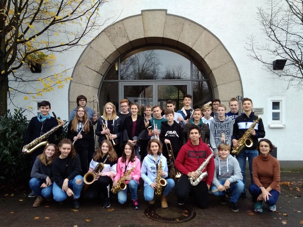 Zuerst war es für viele eine Herausforderung und eine Umgewöhnung, weil nicht nur die reinen Stücke, sondern auch das viele Improvisieren im Vordergrund standen. Die Schülerinnen und Schüler haben viele neue Seiten der Jazz Musik erfahren und ihre eigenen Fähigkeiten auf ihren Instrumenten erweitern können. Eine besondere Unterstützung waren hierbei Frau Coupette, Frau Boßmann und Frau Bunse. Um die Stücke intensiv zu proben, wurden die jungen Musiker, auch in einzelnen Satzproben, von erfahrenen Musikern unterstützt. Ein besonderer Höhepunkt war beispielsweise der Mittwochmorgen, an dem die Junior Band mit einem Mitglied des Bundesjugendjazzorchesters proben durfte! Dies war nochmal eine außergewöhnliche Erfahrung und harte Arbeit zugleich. Vollkommen erschöpft, aber glücklich und zufrieden zugleich, konnten die Musiker dann am Mittwochmittag, den 22.11., ihren Heimweg antreten.