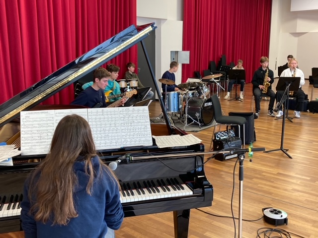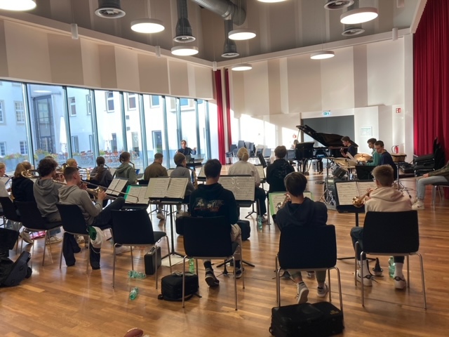 Nach intensiven Satz- und Tuttiproben wurde gegen 21 Uhr die musikalische Arbeit beendet. Die Bandmitglieder:innen ließen den ersten Tag dann noch im Gruppenraum mit Kartenspiel und Kaltgetränken gesellig ausklingen. Am folgenden Tag ergänzte Merlin Hellenkamp, ehemaliger Schüler der Luisenschule und mittlerweile Student für Jazzschlagzeug an der Folkwang Universität der Künste, die Probenarbeit. Neben selbstständiger Einstudierung eines Stückes und Satzproben mit der Rhythmusgruppe inszenierte er darüber hinaus noch am Abend für Interessierte eine kurze Jam Session.