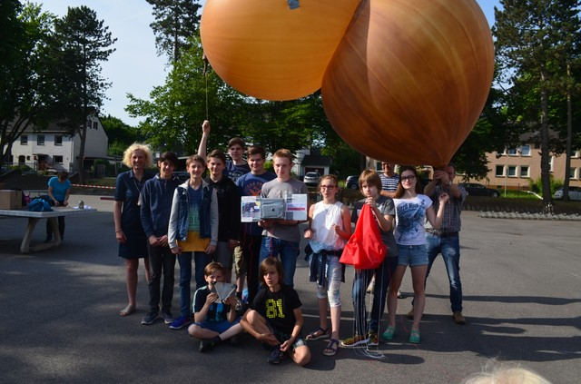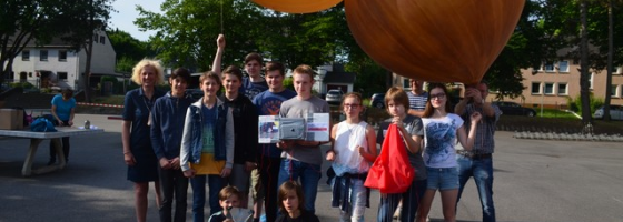Am 15. Juni 2017 war es nach langer Vorbereitung endlich soweit – die Luise, ein Wetterballon, sollte abheben! Zuvor haben wir, eine 14-köpfige Schülergruppe der 5. bis 8. Klasse, unter Anleitung zweier Schüler der Q1, Joshua Krieger und Frederik Simon, und unserer Lehrerin Frau Dr. Schulte seit Beginn des Jahres wöchentlich geschnitten, geklebt, gewogen, berechnet und vieles mehr.