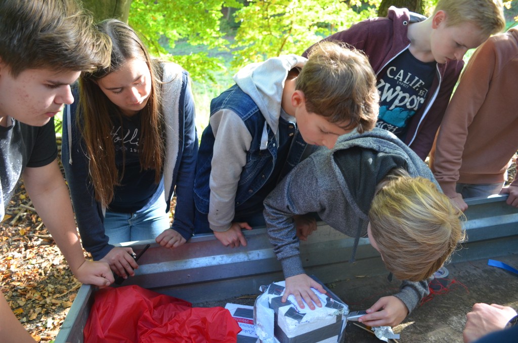 Jeden Mittwoch nach der Schule haben wir uns in diesem Schuljahr, unter der Leitung von Frederik Simon, Joshua Krieger, beides Schüler der Q2, und Frau Dr. Schulte getroffen, um unter anderem eine Sonde zu basteln, die alle unsere Messgeräte, Kameras und Plastikproben sicher in über 30.000m Höhe und wieder zurück bringen sollte. Anfangs haben wir uns einen Bauplan erstellt, wie wir mit ein paar Styroporplatten, genau diese Sonde bauen könnten. Nachdem wir diese Aufgabe gemeistert und eine stabile, den Platz optimal ausnutzende, dennoch leichte Kapsel erschaffen hatten, kümmerten wir uns um die Messgeräte für die Temperatur, den Luftdruck und Ozonwert.