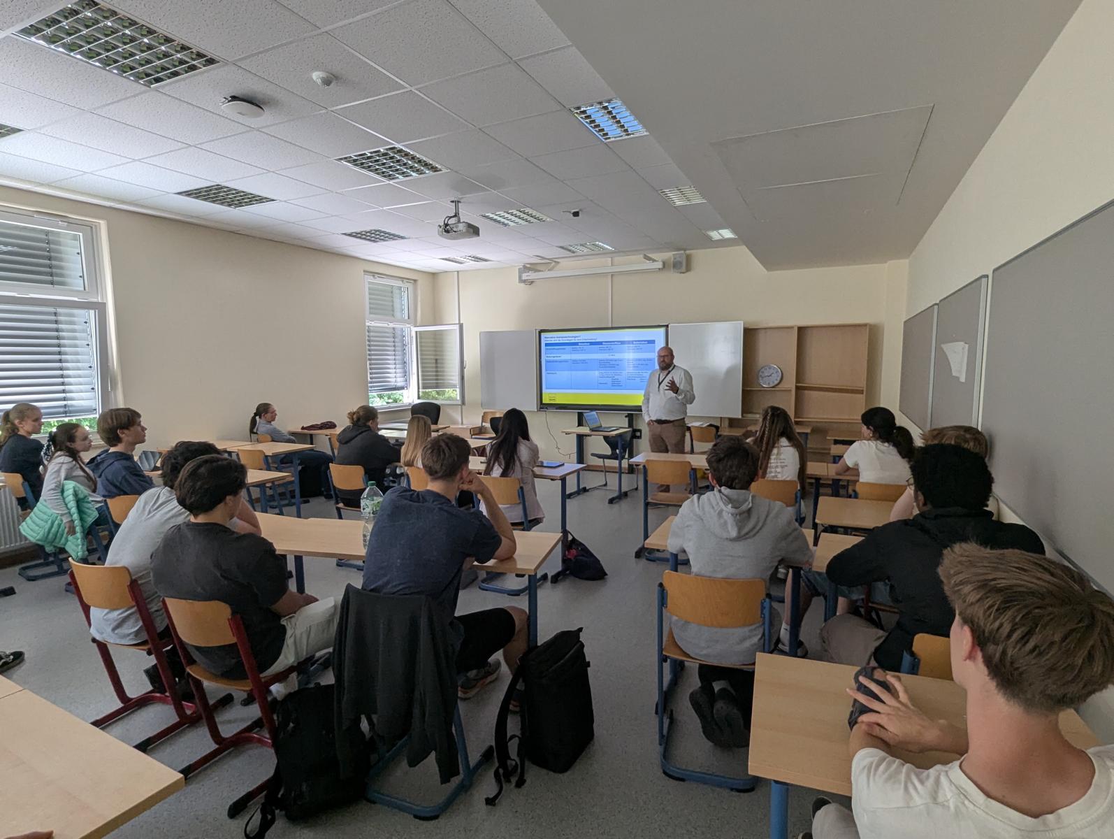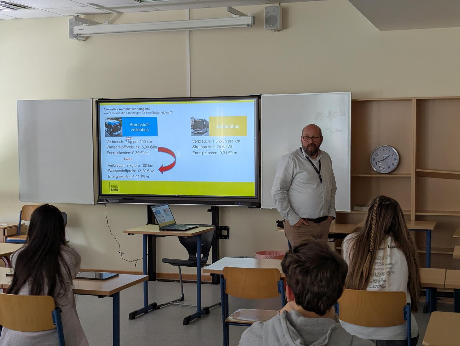 Umso glücklicher war der Erdkundekurs von Herrn Bergers, dass sich nach dreieinhalb Jahren in Person von Herrn Rolf Sprenger erneut ein Vertreter der Ruhrbahn bereiterklärte, ein Update zum aktuellen Stand der Umsetzung zu geben. So erfuhren wir, dass zwar seit einigen Monaten die ersten Wasserstoffbusse in Mülheim und Essen rollen, jedoch nicht mit Sicherheit feststeht, ob dieser Weg von der Ruhrbahn weiter so beschritten werden kann. Dies hat den Hintergrund, dass aufgrund der mittlerweile eingestellten Förderungen enorm gestiegene Kosten bei Beschaffung, Betrieb und Infrastruktur auf das kommunale Unternehmen zukommen. Jedoch ist der Handlungsdruck enorm, da aufgrund von EU-Richtlinien eine baldige Umstellung auf nachhaltige Antriebsformen erfolgen muss. Mit authentischen betriebswirtschaftlichen Zahlen konnten wir das „Dilemma“ der Ruhrbahn nachvollziehen und diskutierten lebendig, wie wir uns angesichts dieser Sachlage entscheiden würden.