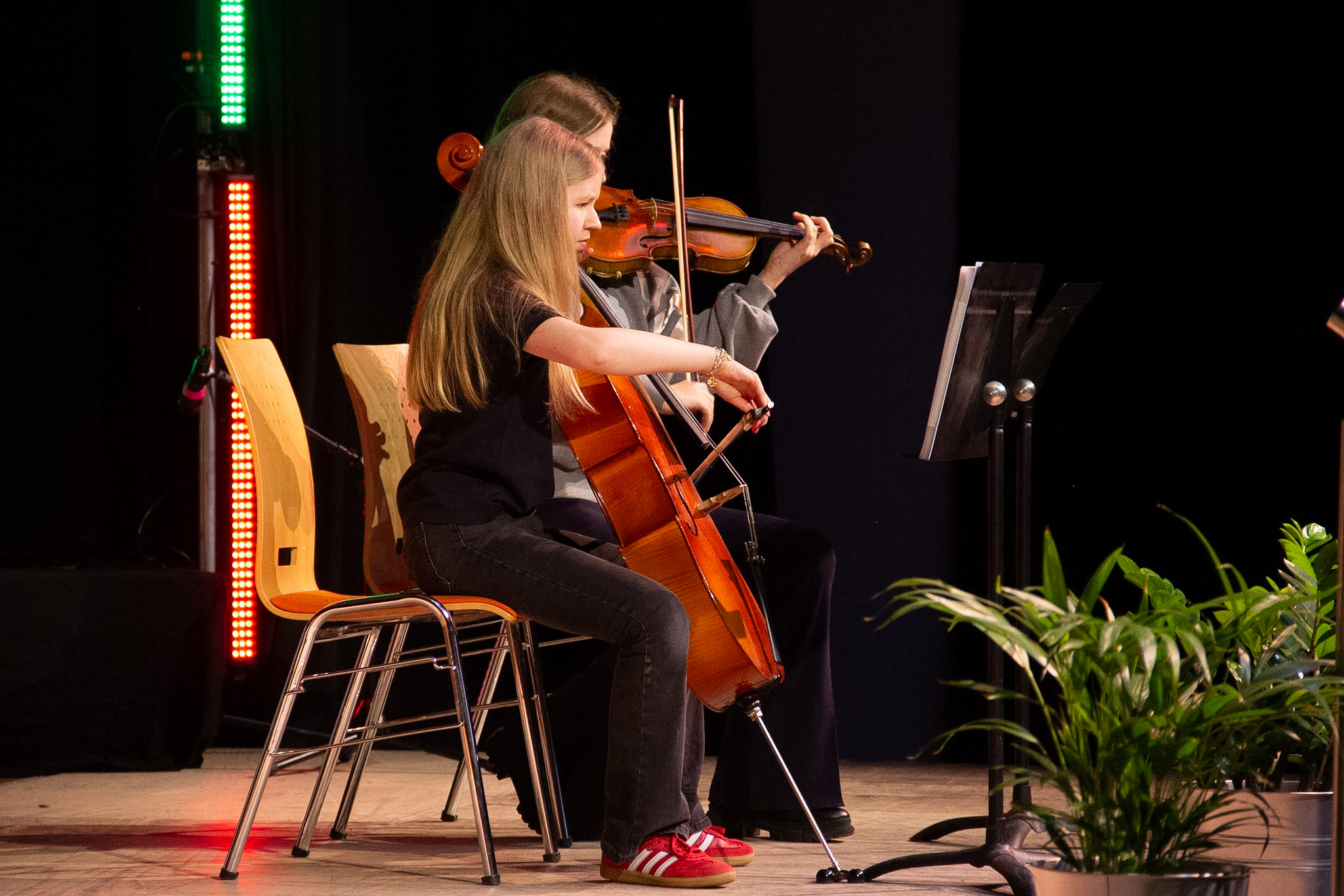 Neben diesen solistischen Beiträgen wurden auch erfolgreich Duette intoniert. Lara Farag (5b) und Antonio Restemeier (5b) spielten mit Blockflöten Das Schloss und Karawane, Till Drewitz (7a) bildete gemeinsam mit Felix Jaspers (7f) ein Gitarren-Duo, welches dann Mad World und The Western Sky darbot, und Sophia Geist (Violine) und Meret Meznar (Violoncello) präsentierten Paul Desmonds Take Five. Zusätzlich dazu spielten Clara Fleischheuer am Altsaxophon und Alvin Fleischheuer (5c) am Sopransaxophon City of Stars.