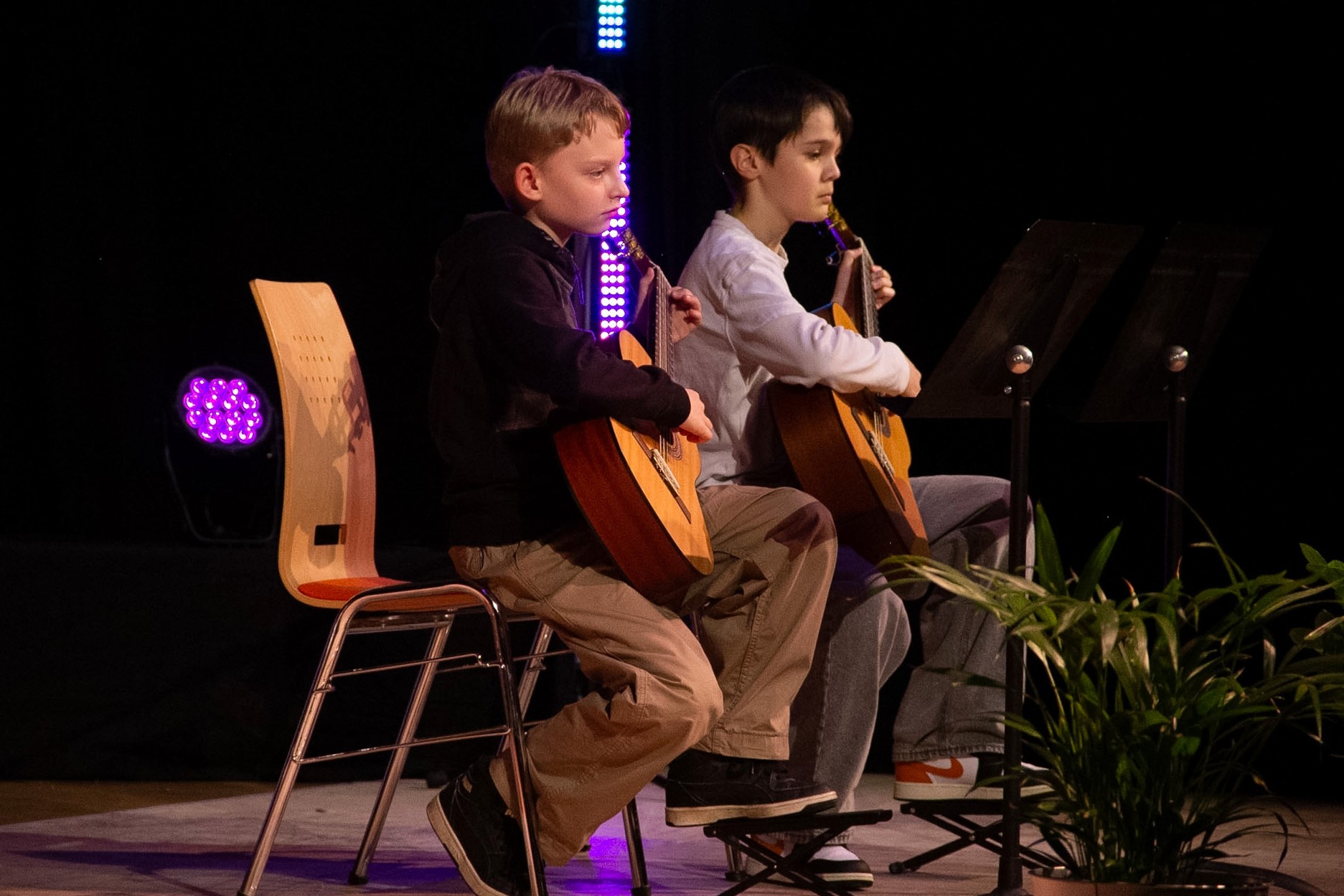 Mit Jorin Steger (Q1), der den Jazz-Standard All The Things You Are präsentierte, Lennart Urban (8b), der ein Medley von Metallica-Balladen spielte, und Anna Weis (9b) mit Vidalita überzeugten an diesem Abend zudem drei Solo-Gitarrist:innen. Als weitere Solist:innen anderer Instrumentengruppen begeisterten darüber hinaus noch Nestor Pantazis (5c) am Schlagzeug zu Sweet Child O’Mine von Guns’N’Roses, Fabian Walter (10a) an der Oboe mit Bachs Siciliano sowie Sophia Geist (8a) mit einem Auszug aus dem Violinkonzert von Anatoli Komarowski.