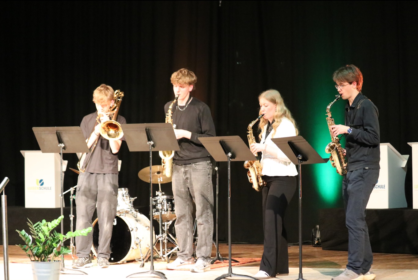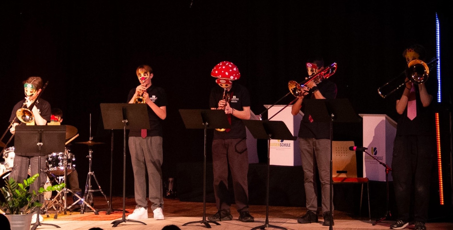 Außerdem bildete sich für diesen Abend ein Brass-Ensemble aus den Posaunisten Mats Jebbink (8d), Max Ritschel (10b) und Fabian Westphal (10d) sowie den Trompetern Valentin Kaiser (9c) und Jan Dannenberg (9c), die halbkostümiert und auf amüsante Art das Super Mario Theme präsentierte. Unterstützt wurden sie dabei von Nestor Pantazis am Schlagzeug. Mit Sophie Johannknecht (Q1), Hendrik Stahmann (Q1), Anton Westphal (Q1) und Fabian Festphal (Q1) spielte letztlich auch ein „Saxophon“-Quartett den Jazz-Klassiker Hit the Road Jack, wobei Fabian mit seiner Posaune, den erkrankten Baritonsaxophonisten erfolgreich vertrat.