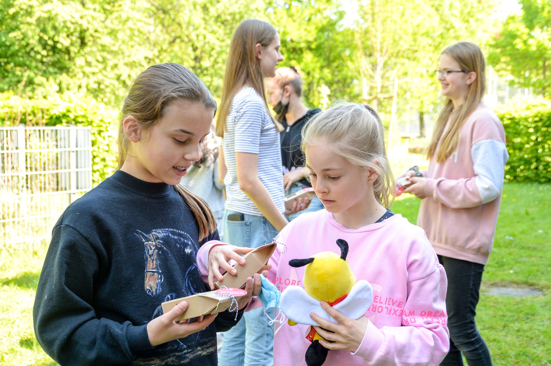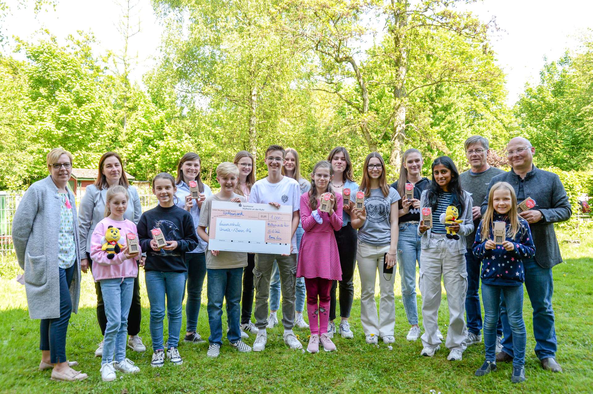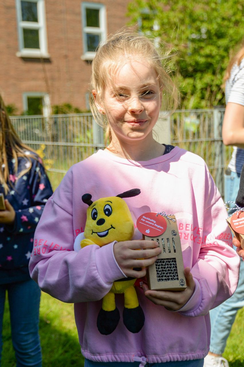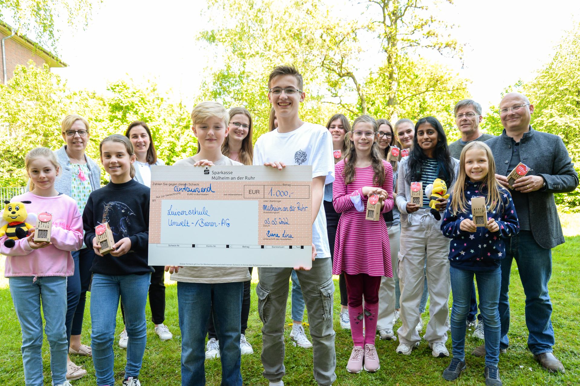 Unter dem Motto „Bienen sind für unsere Umwelt und unser tägliches Leben unverzichtbar“ nahm die Schulbienen-AG der Luisenschule an einem Projektwettbewerb der Sparkasse Mülheim teil. Dabei belegte die Schulbienen-AG mit ihrem tollen und wichtigen Bienenprojekt den 1. Platz. Am 03.05.2022 kamen also Mitarbeitende der Sparkasse Mülheim in den Schulgarten der Luisenschule, um der Schulbienen-AG persönlich den Preis von 1000€ in Form eines Schecks zu überreichen. Dieser ermöglicht es uns, uns noch intensiver mit den Bienen zu beschäftigen. Ob wir Imkerhut und -handschuhe oder neue Holzbeuten und Brutrahmen anschaffen, eine artgerechte Versorgung dieser wichtigen Tiere ist bei uns hier auf jeden Fall gewährleistet. Auch Biene Lina, unser neues Maskottchen, freut sich über die großzügige Unterstützung, durch die wir ihren Artgenossen weiterhin ein schönes zu Hause bieten können.