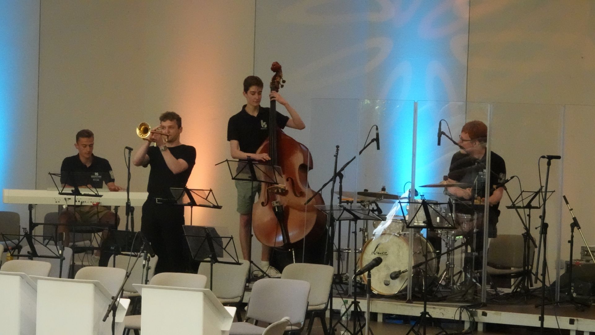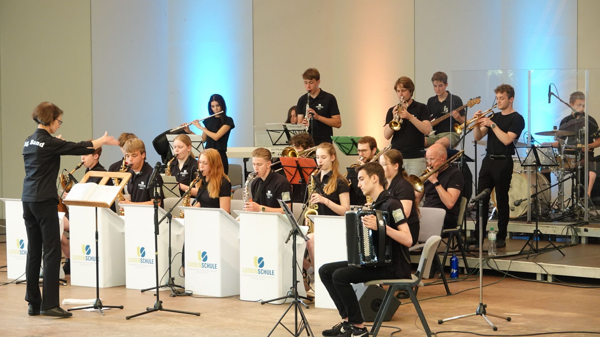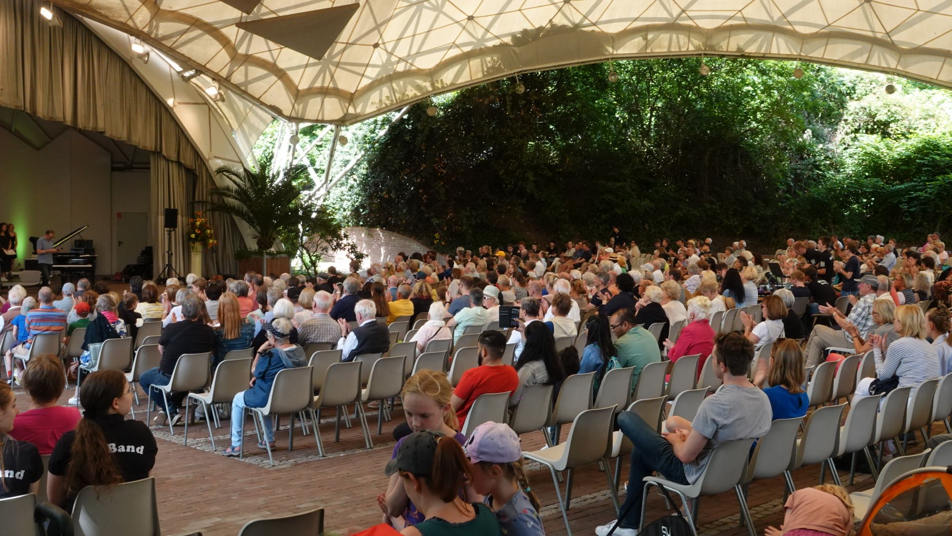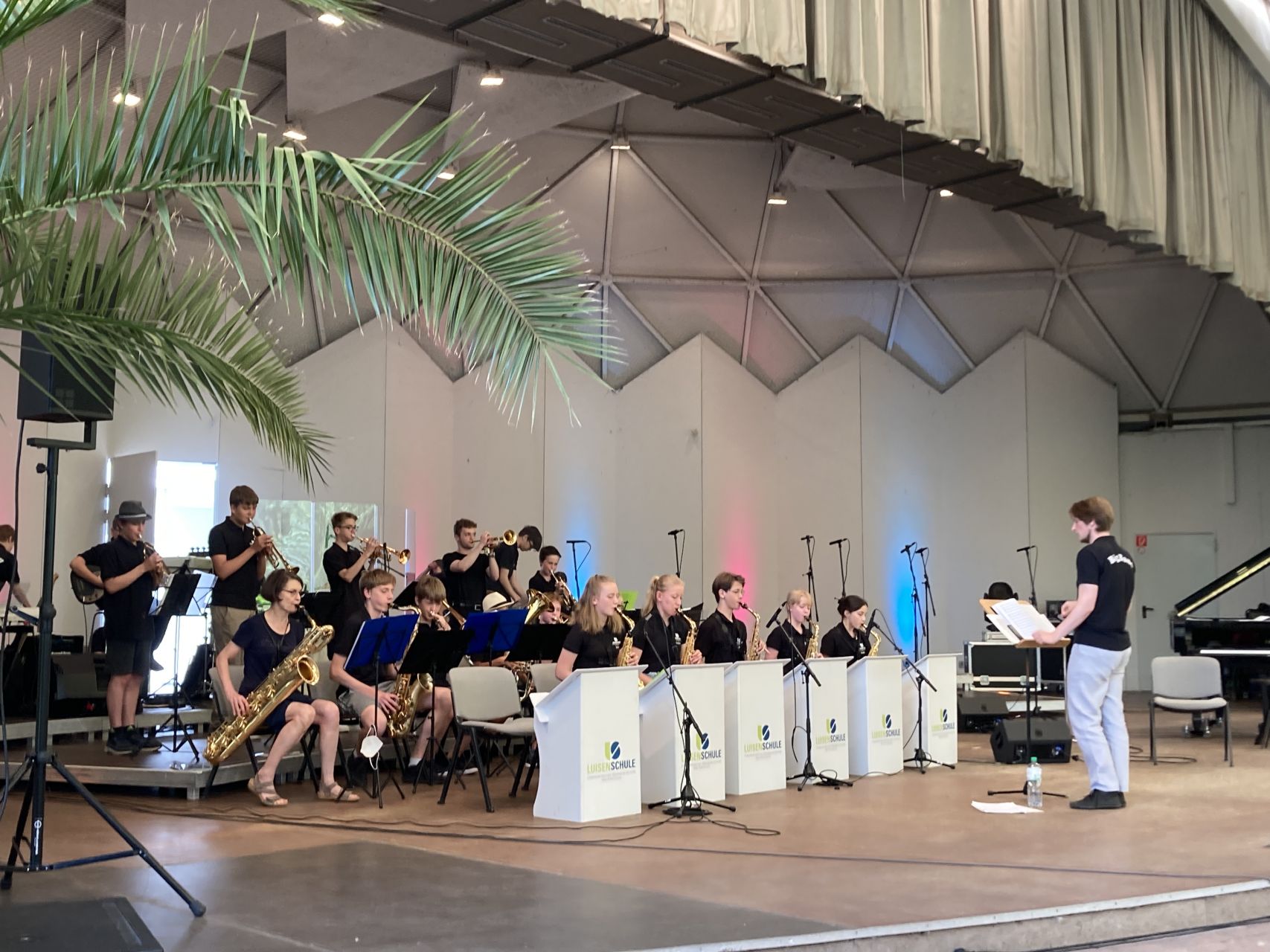 Bis zu 600 Zuschauer haben am Sonntag, dem 12. Juni 2022, bei sommerlichen Wetterbedingungen die Einladung unserer BigBand in den Musikpavillon des Grugaparks in Essen angenommen und ein abwechslungsreiches Konzert erlebt. Unter dem Motto „Swing liegt in der Luft“ wurde das begeisterte Publikum auf eine musikalische Reise in die Welt des Bebop, Blues, Swing bis zum Funk und Pop mitgenommen. Den Startschuss hat die Juniorband traditionell mit der Fanfare aus der Filmmusik zu „Star Wars“ abgegeben, die BigBand hat mit beliebten Ohrwürmern wie „Route 66“, „Fly me the moon“ und „Libertango“ die Vorfreude auf die Sommerferien zum Klingen gebracht. Auch der Vokalpraktische Kurs, der Corona bedingt seit drei Jahren keinen öffentlichen Auftritt mehr hatte, durfte sich mit beliebten Songs wie „Only you“ und „I have a Dream“ zurückmelden. Mit dem gemeinsamen Song „Africa“ und weiteren Zugaben haben sich die jungen MusikerInnen schließlich für den großen Beifall der Gäste bedankt.