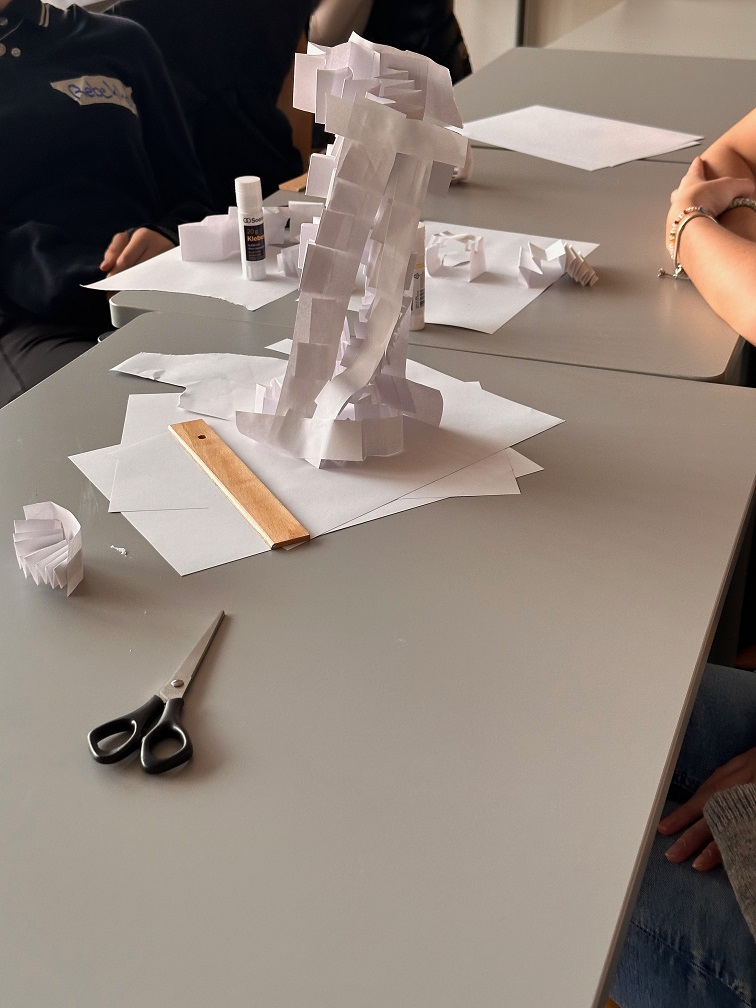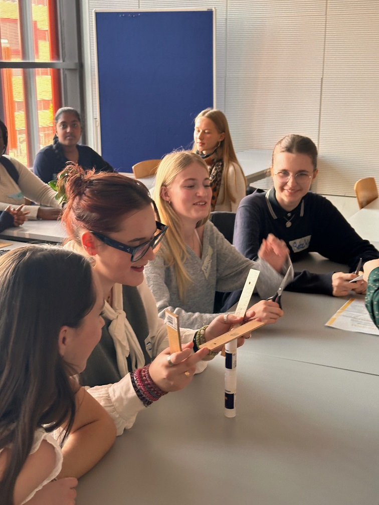 Nach der Ehrung der ehemaligen Teilnehmerinnen gab es noch Grußworte der Veranstalter*innen, Denise Sarholz und Prof. Dr. Alexandra Dorschu. Nach einer kurzen Pause mit Buffet bekamen die Eltern eine Führung durch das Technikum und alle Teilnehmerinnen bekamen eine praktische Aufgabe. Innerhalb von 10 Minuten mussten wir, die Mädchen des neunen und alten Jahrgangs, gemeinsam in Vierergruppen einen möglichst hohen und stabilen Turm aus Papier bauen, welcher dann ein Lineal halten musste. Hierbei gab es ganz vielfältige Herangehensweisen, wir alle waren voller Tatendrang.