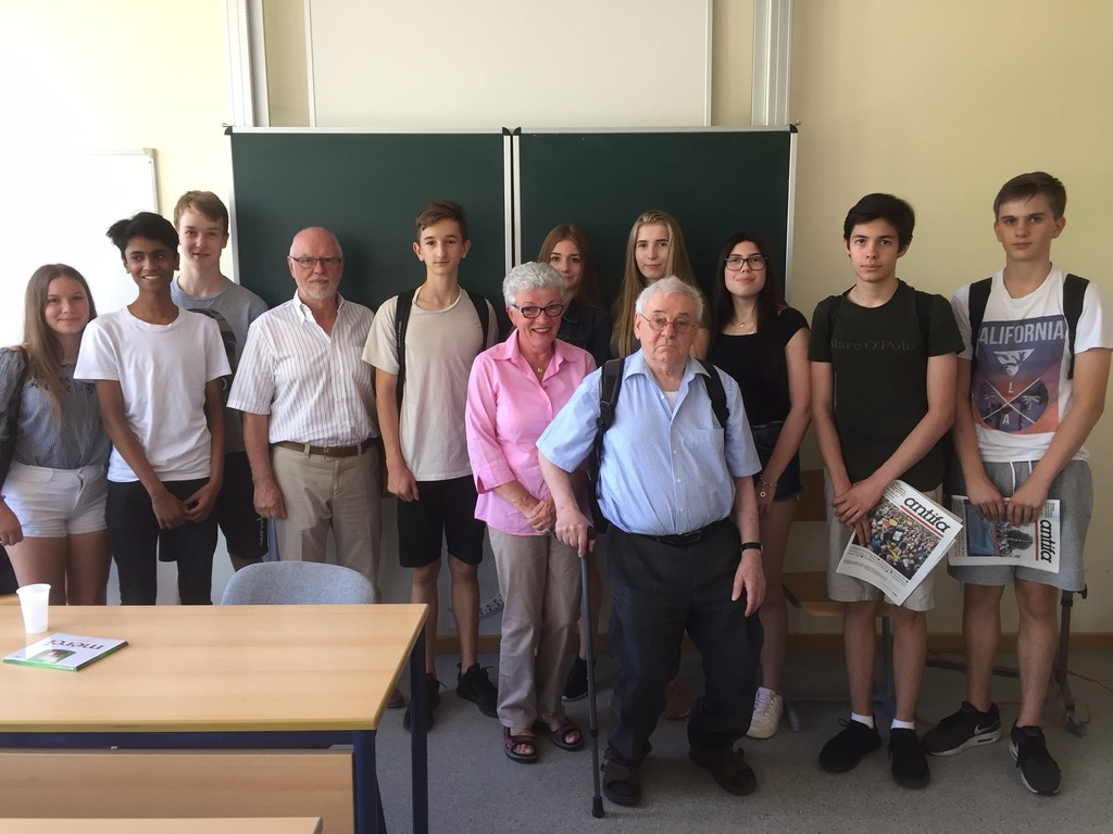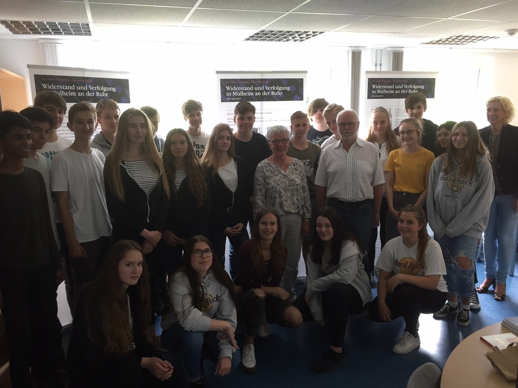 Der 88-jährige Zeitzeuge Helmut Hermann, Mit-Initiator der Ausstellung und langjähriger Vorsitzender der Vereinigung der Verfolgten des Naziregimes, berichtete schließlich am 29.06. den Schülerinnen und Schülern der Klasse 9c - über seine eigene Kindheit in der NS-Diktatur. So erfuhren die Jugendlichen von den Repressionen, die auf Familie Hermann aufgrund ihrer kommunistischen Einstellung einwirkten. Zudem hatten die Neuntklässlerinnen und Neuntklässler die Möglichkeit, den Zeitzeugen Hermann, welcher auch Träger der Ehrenspange der Stadt Mülheim ist, zum Leben unter dem Hakenkreuz und den Auswirkungen auf das weitere Leben zu befragen.